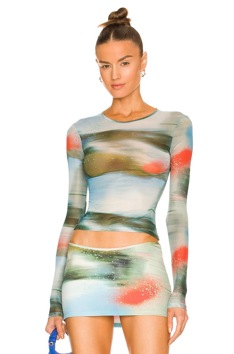 Semi-sheer mesh fabric blends with an abstract all-over print in muted blue, olive, coral, and beige hues to create a striking, trendy shell top. The slim fit accentuates the waist, while the long sleeves and classic round neck add to its versatile appeal. Perfect for casual outings, night outs, or brunch dates, this waist-length pullover top pairs effortlessly with skirts or jeans. Made with a comfortable blend of polyester and elastane, it offers stretch and breathability for warm spring to autumn days.