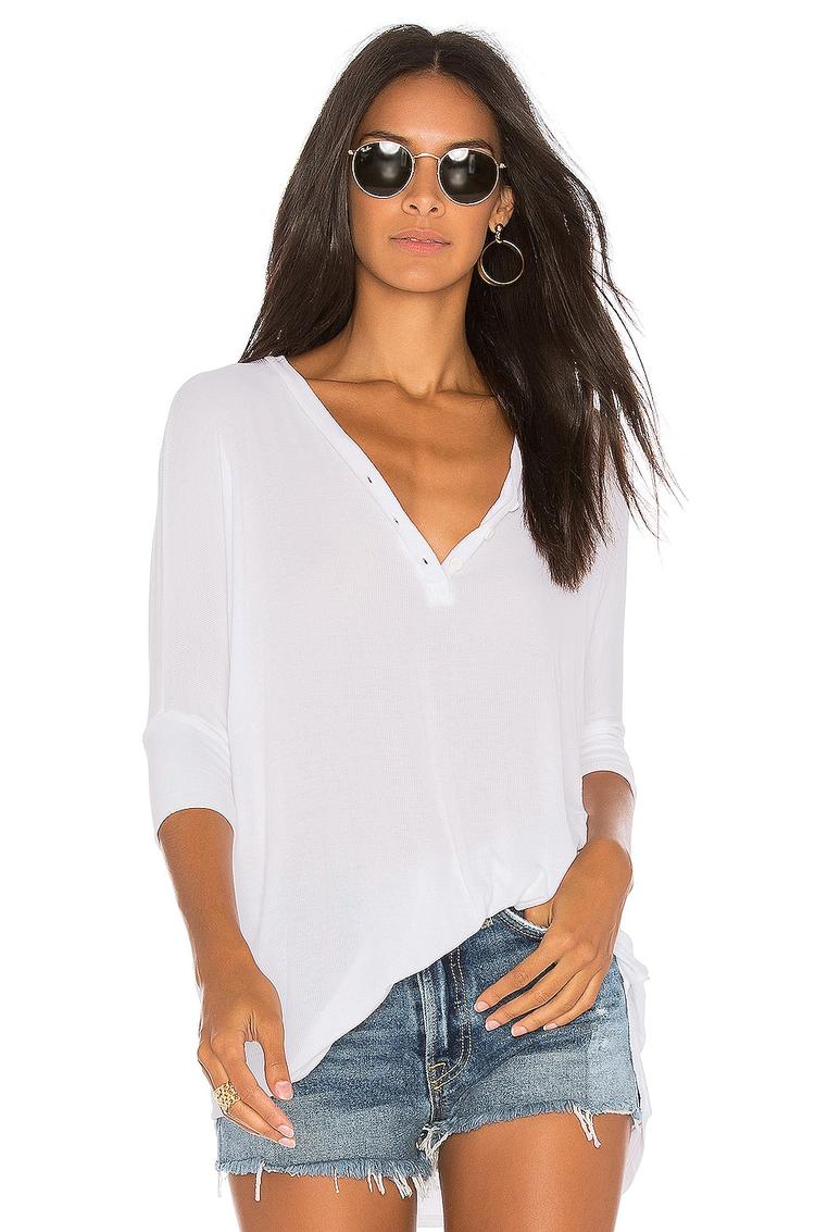 Soft ribbed jersey fabric blends viscose and spandex for breathable comfort and a slight stretch. The Michael Lauren Amos Tee features a relaxed fit with three-quarter cuffed sleeves and a classic V-neckline with a partial front button closure, offering easy wearability. Falling to hip length, this minimalist white Henley top pairs effortlessly with casual denim for brunch, everyday wear, or laid-back spring and summer outings. Its clean silhouette and subtle ribbed texture create a chic yet understated look perfect for versatile casual chic styling.