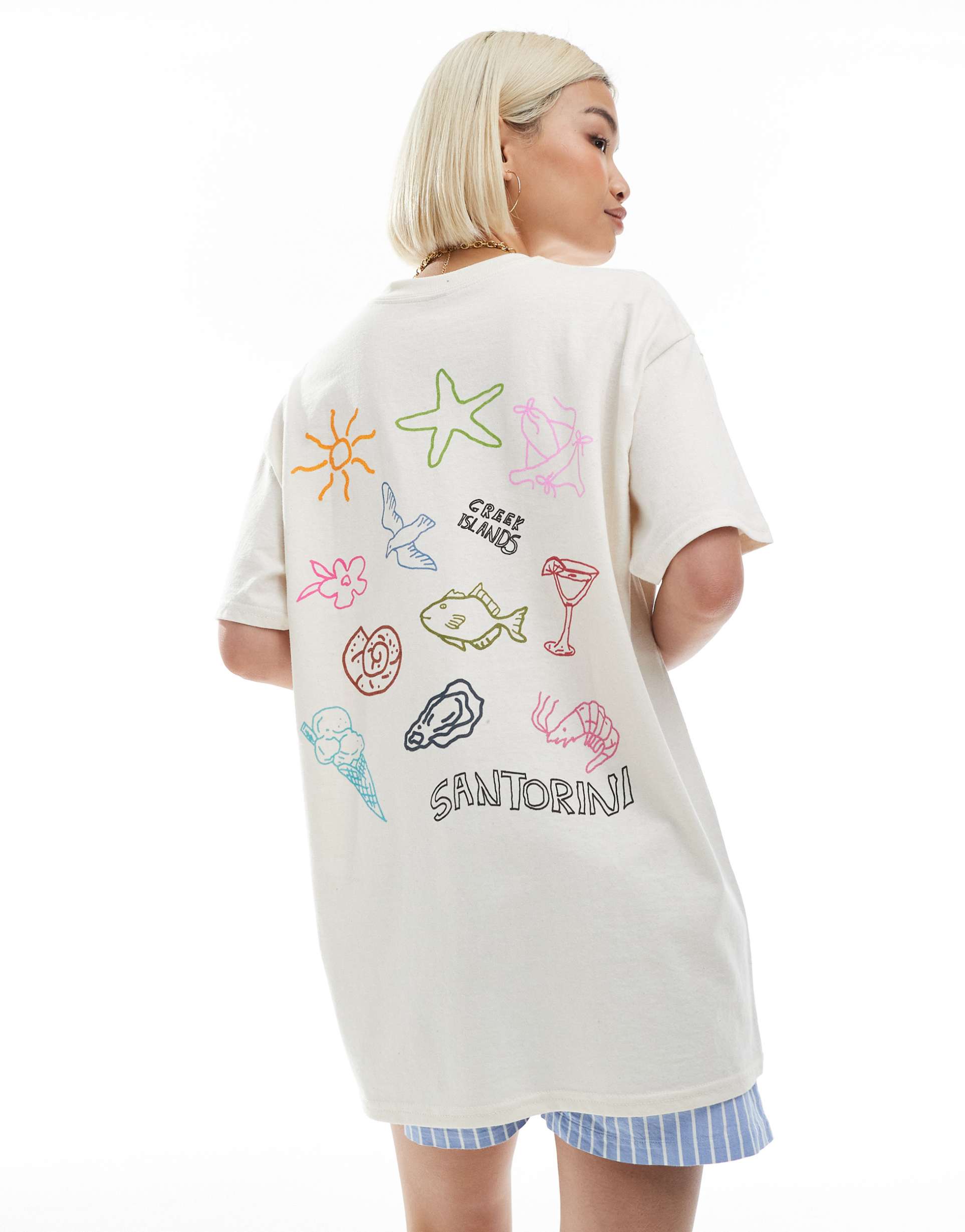 Soft cotton jersey and a relaxed oversized fit define this casual chic tee, featuring a classic crew neck and half drop shoulder sleeves for a laid-back vibe. The hip-length swing silhouette is elevated with playful Santorini-inspired graphic prints on the front and back in bright pastel hues, perfect for everyday wear, casual brunches, or street style outings. Comfortable and versatile, it pairs effortlessly with shorts or jeans for a fresh seasonal look.