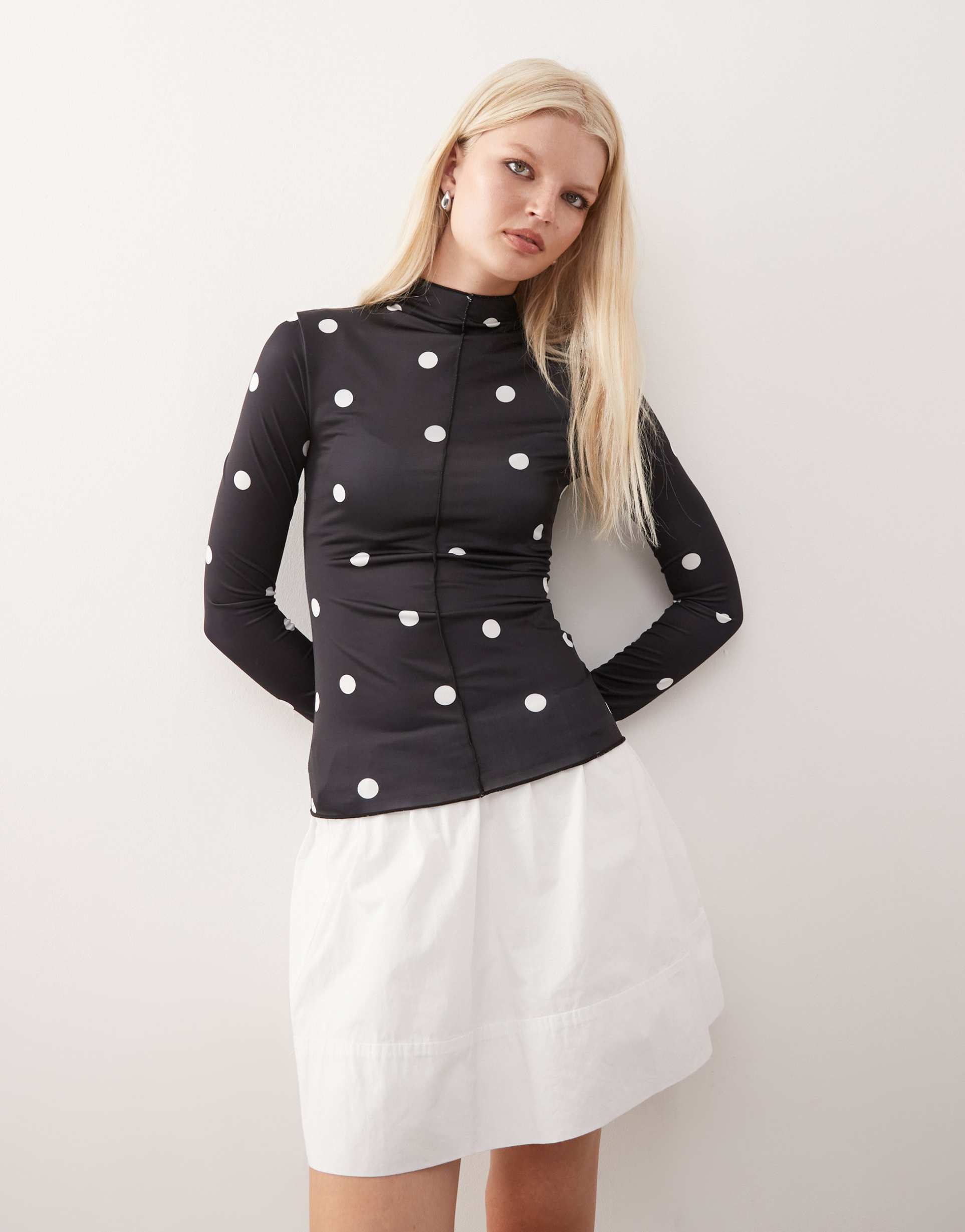 Soft, sheer mesh and a slim fit define this chic black shell top by Monki, featuring a high neckline and long regular sleeves for versatile layering. The hip-length silhouette is adorned with classic white polka dots all over, while exposed seam details on the front add subtle texture and modern appeal. Perfect for casual outings, streetwear looks, or smart business casual occasions, this lightweight, breathable polyester top elevates your wardrobe with minimalist style and seasonal adaptability.