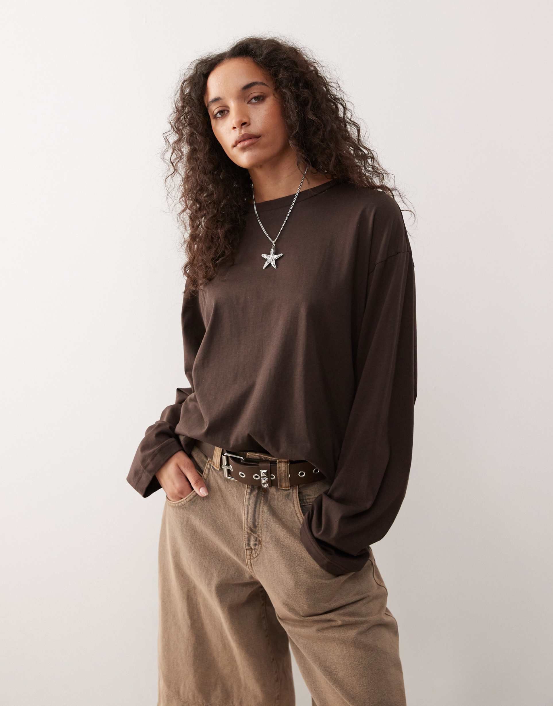 MONKI OVERSIZED LONG SLEEVE T-SHIRT WITH SIDE SLITS IN CHOCOLATE BROWN