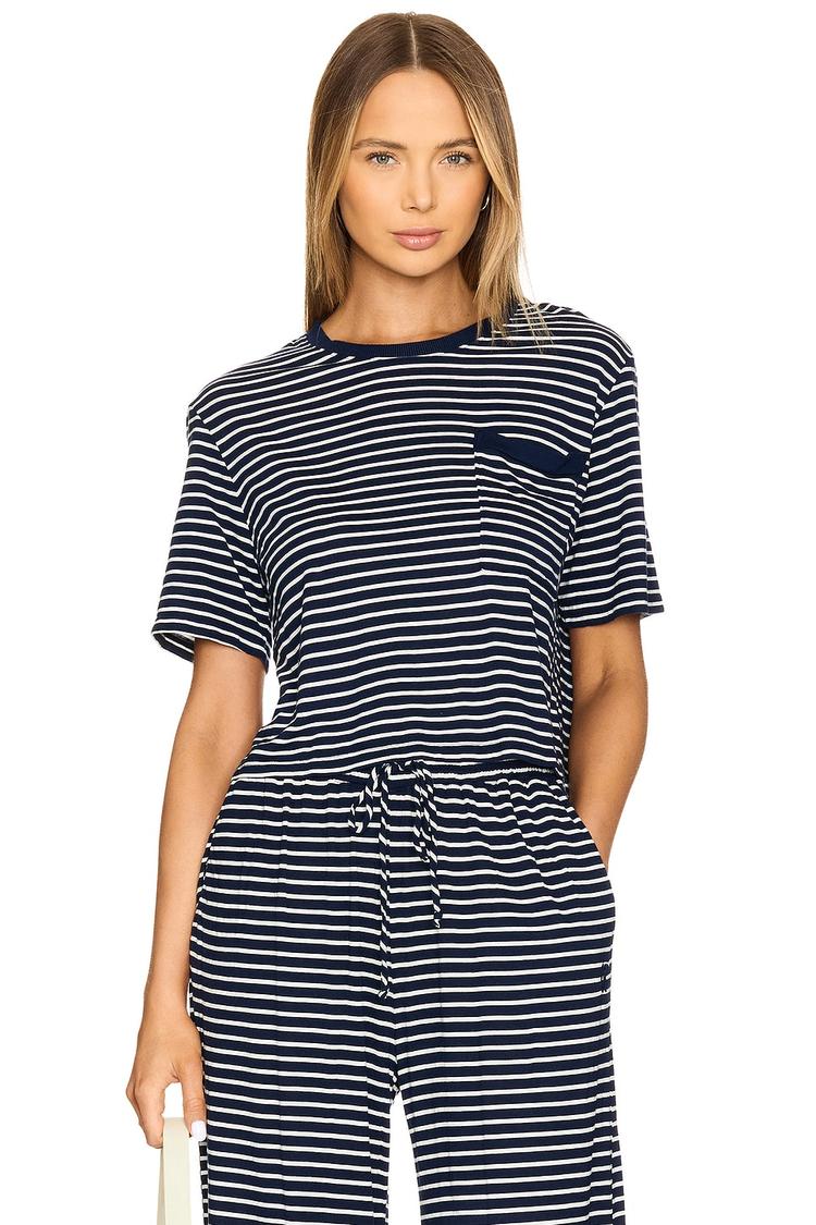 Feel the easy vibe of a sunlit afternoon in this Stripe Crop Pocket Tee. The lightweight modal-cotton jersey drapes softly in a cropped, relaxed fit, striped in navy and white. A crisp navy rib crew neck frames the neckline, while a single chest pocket and an adjustable drawstring waist add practical flair. The all-over stripe and breathable fabric make it versatile—from casual daytime jeans to weekend lunches or vacations. Effortless, minimalist, and endlessly wearable, this top is a timeless staple that pairs with almost anything for chic, laid-back style.