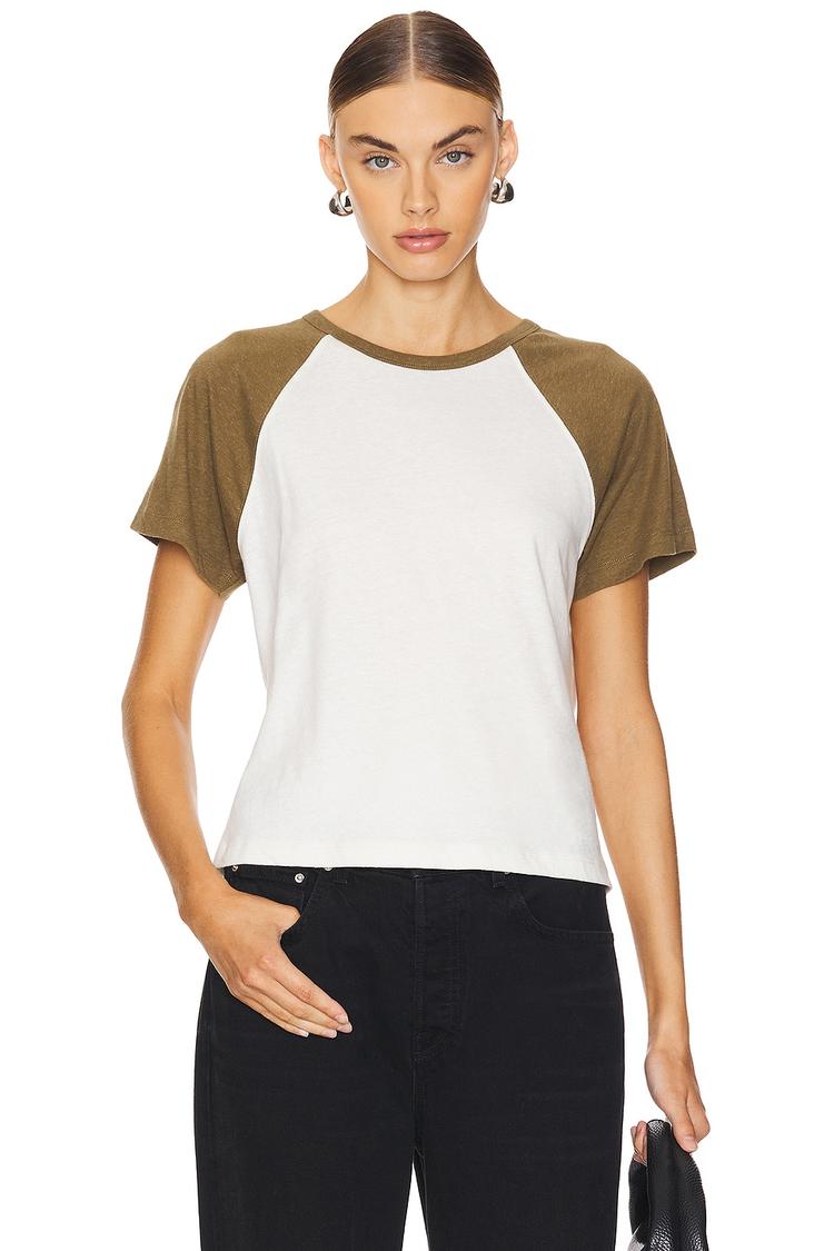 A timeless baseball tee crafted from lightweight cotton jersey, featuring a relaxed regular fit and hip-length silhouette. This casual chic top showcases classic color-blocked design with matte white on the body and matte tan raglan half sleeves and collar. The crew neckline and pullover styling add to its minimalist appeal, making it perfect for casual outings, everyday wear, or travel. Its breathable fabric and versatile style ensure comfort and effortless pairing with a variety of bottoms for streetwear or laid-back occasions.