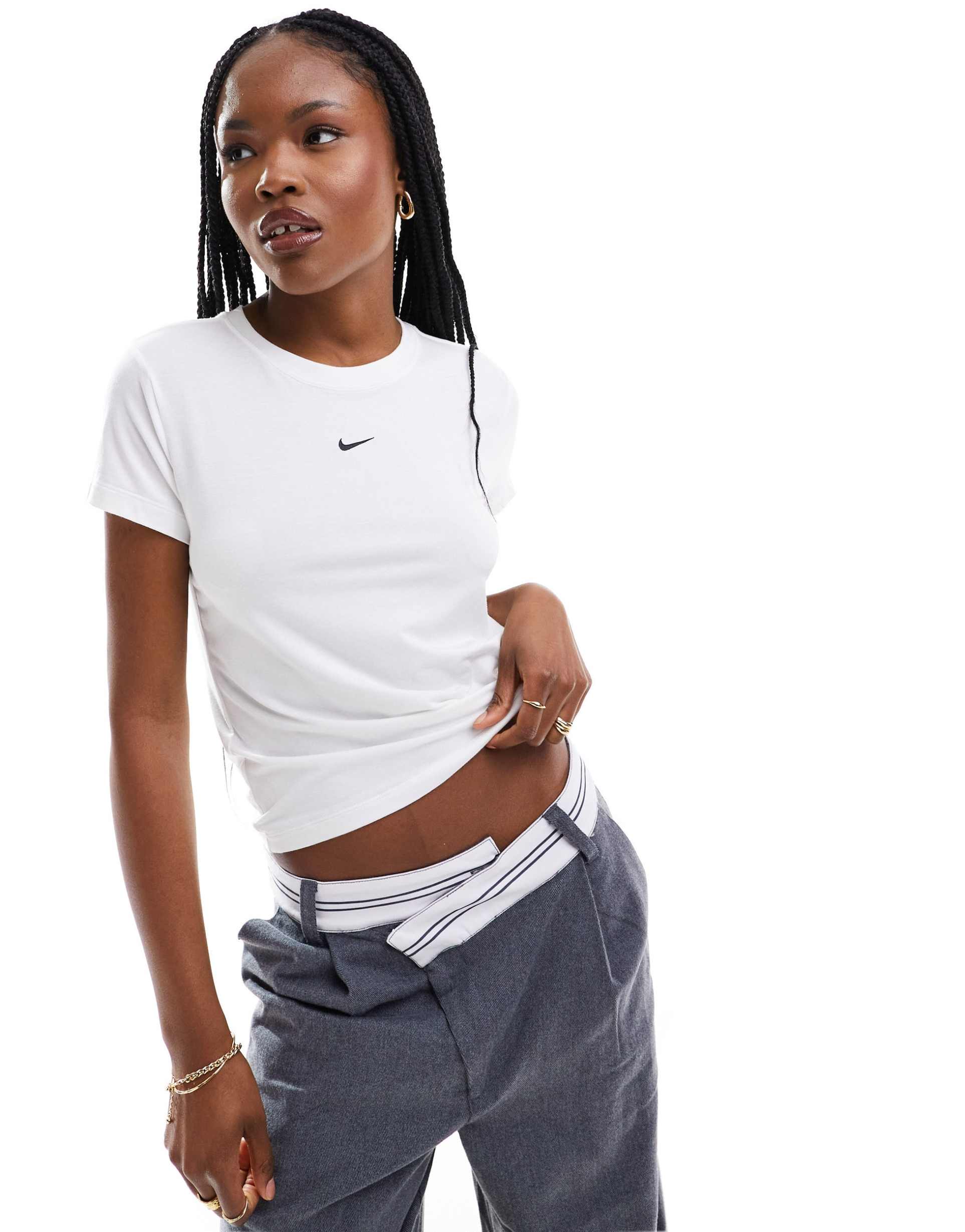 Crisp white cotton jersey meets a cropped silhouette in this Nike t-shirt, featuring a classic crew neck and half sleeves for everyday comfort. The regular fit and breathable fabric make it perfect for casual wear, workouts, and travel alike. A subtle black Nike embroidery on the front adds sporty minimalism to this versatile piece that pairs effortlessly with high-waisted bottoms. Ideal for spring through autumn, this regular size top blends function and style with ease.