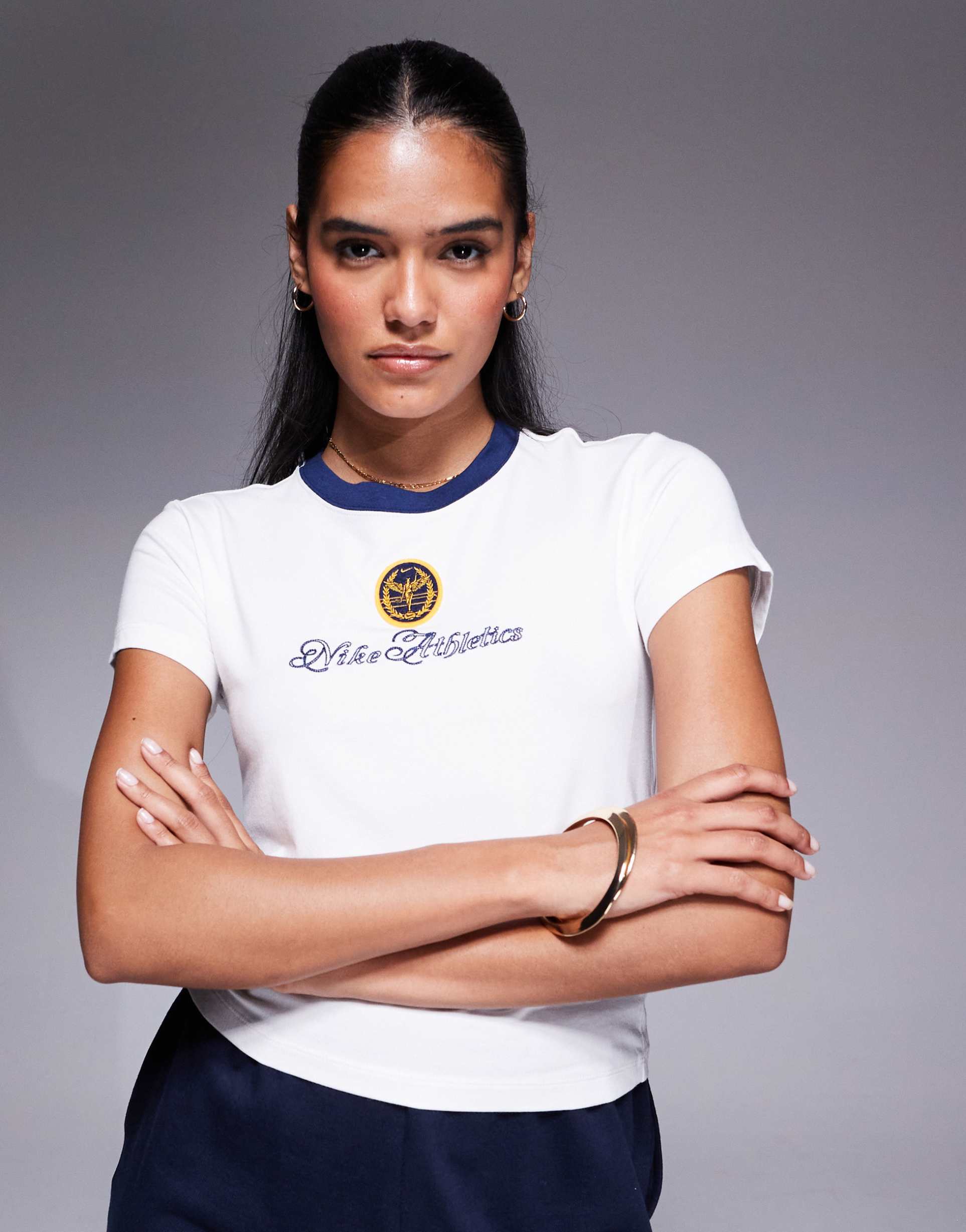 Soft, stretchy cotton jersey combines with a fitted shell silhouette in this Nike Court Club T-shirt. Featuring a classic crew neck and half sleeves with navy trim, it offers a sporty chic vibe elevated by gold embroidery on the front and a logo print on the back. The waist-length cut and slim fit make it perfect for casual days, streetwear looks, or light workouts. Its minimalist design and breathable fabric ensure all-weather comfort and versatility for a range of occasions.