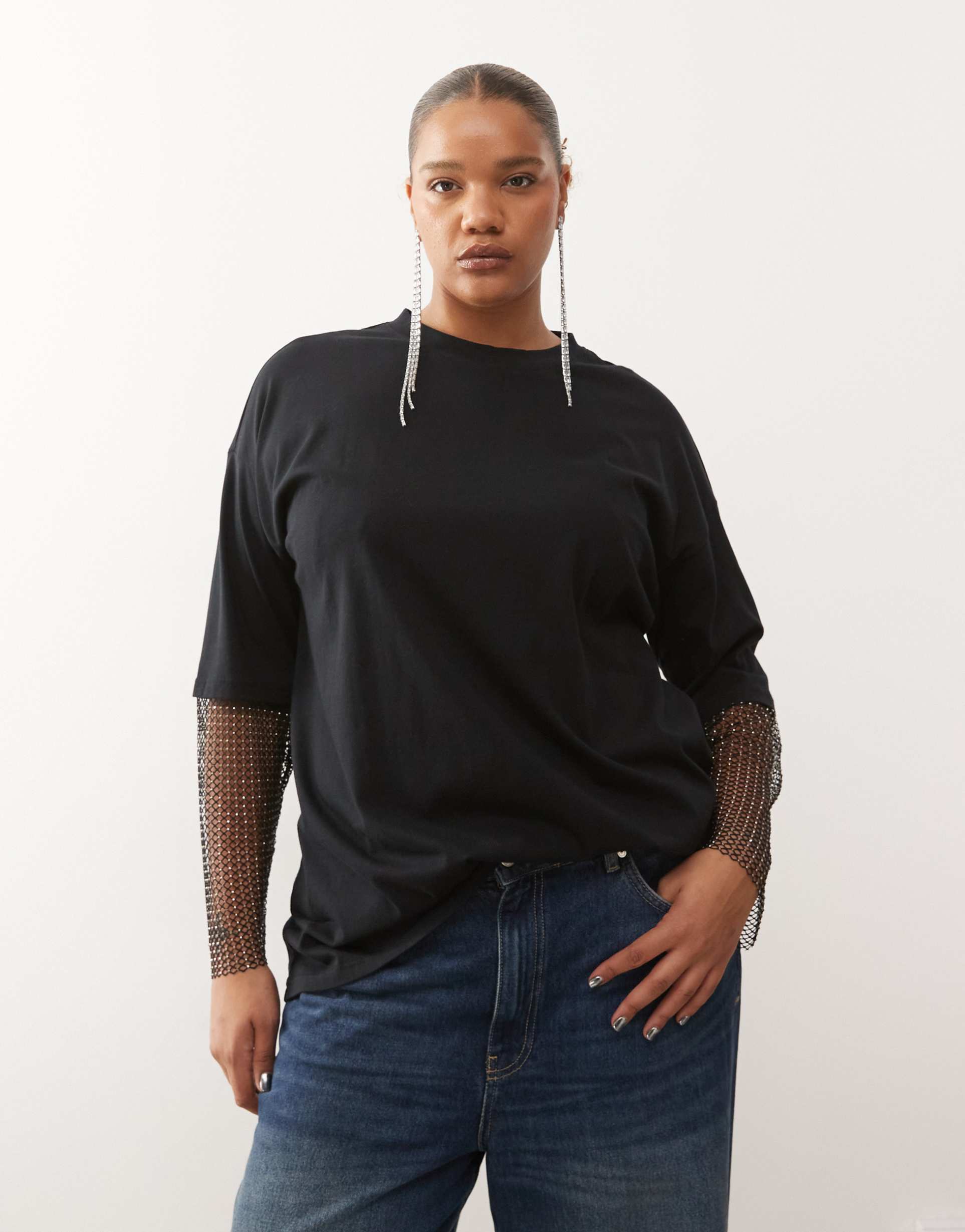 NOISY MAY CURVE OVERSIZED T-SHIRT WITH RHINESTONE SLEEVES IN BLACK