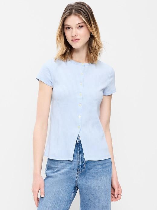 SHORT-SLEEVE RIBBED BUTTON-DOWN TOP