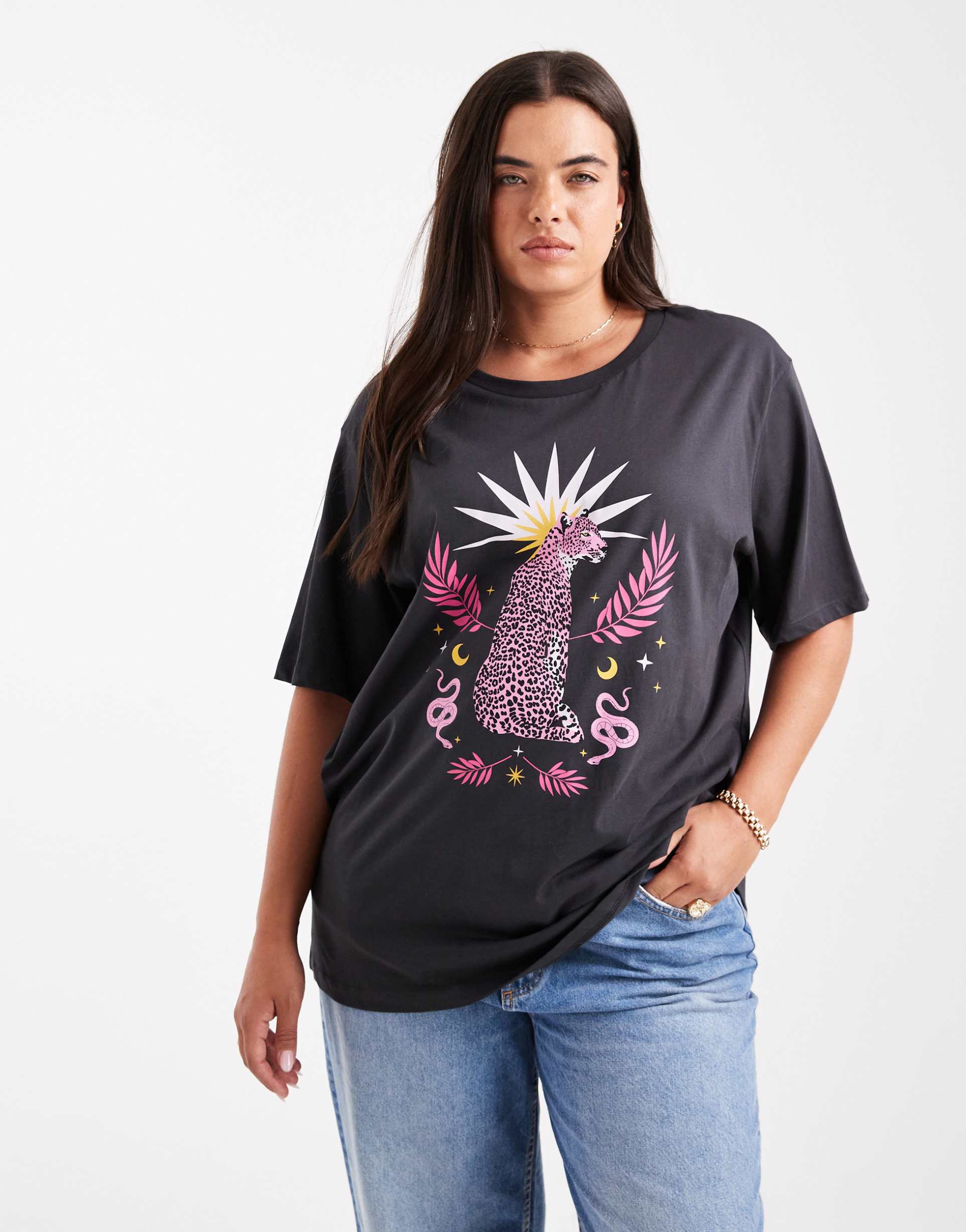 ONLY CURVE LEOPARD GRAPHIC OVERSIZED FIT T-SHIRT IN CHARCOAL