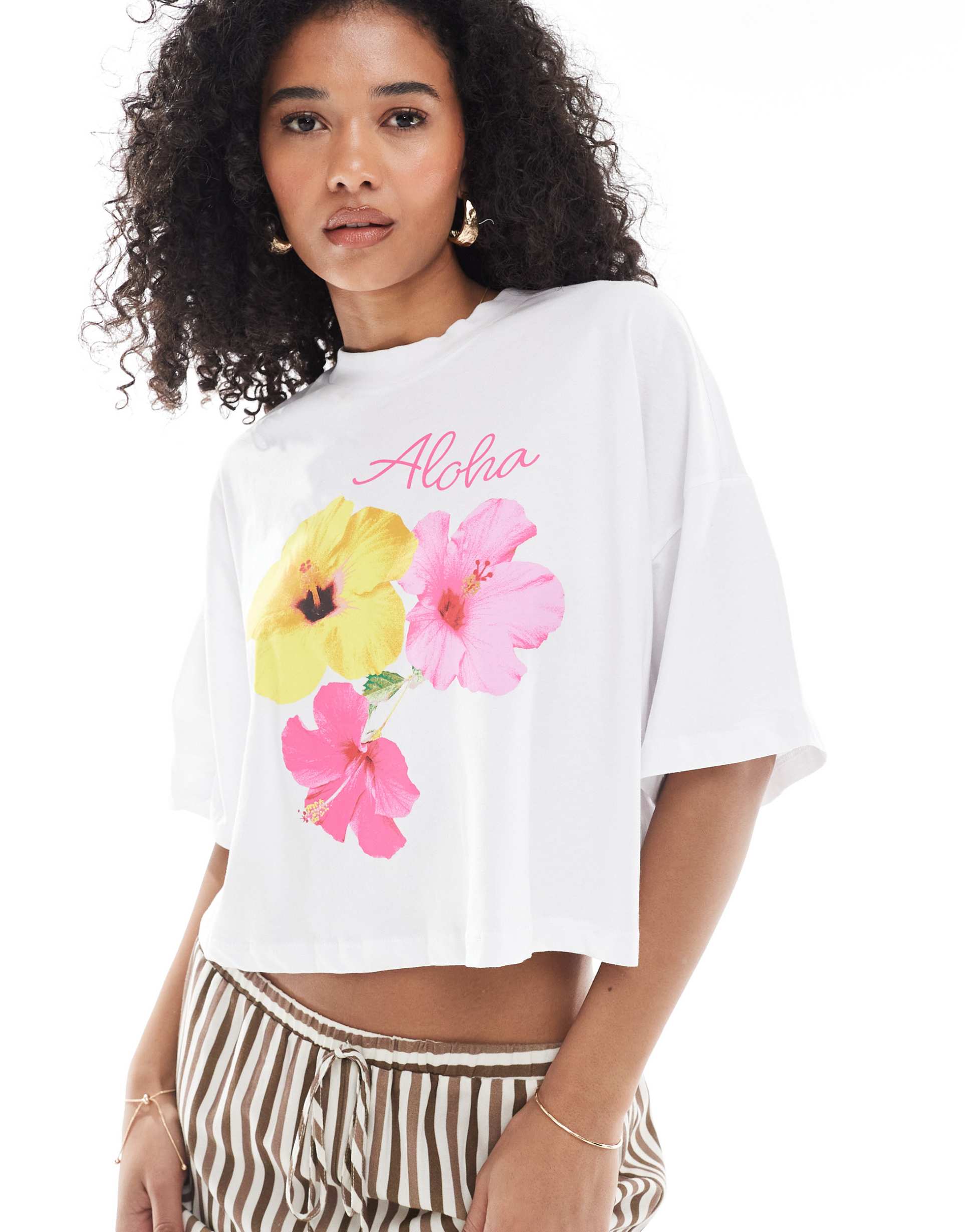 ONLY HIBISCUS GRAPHIC CROPPED T-SHIRT IN WHITE