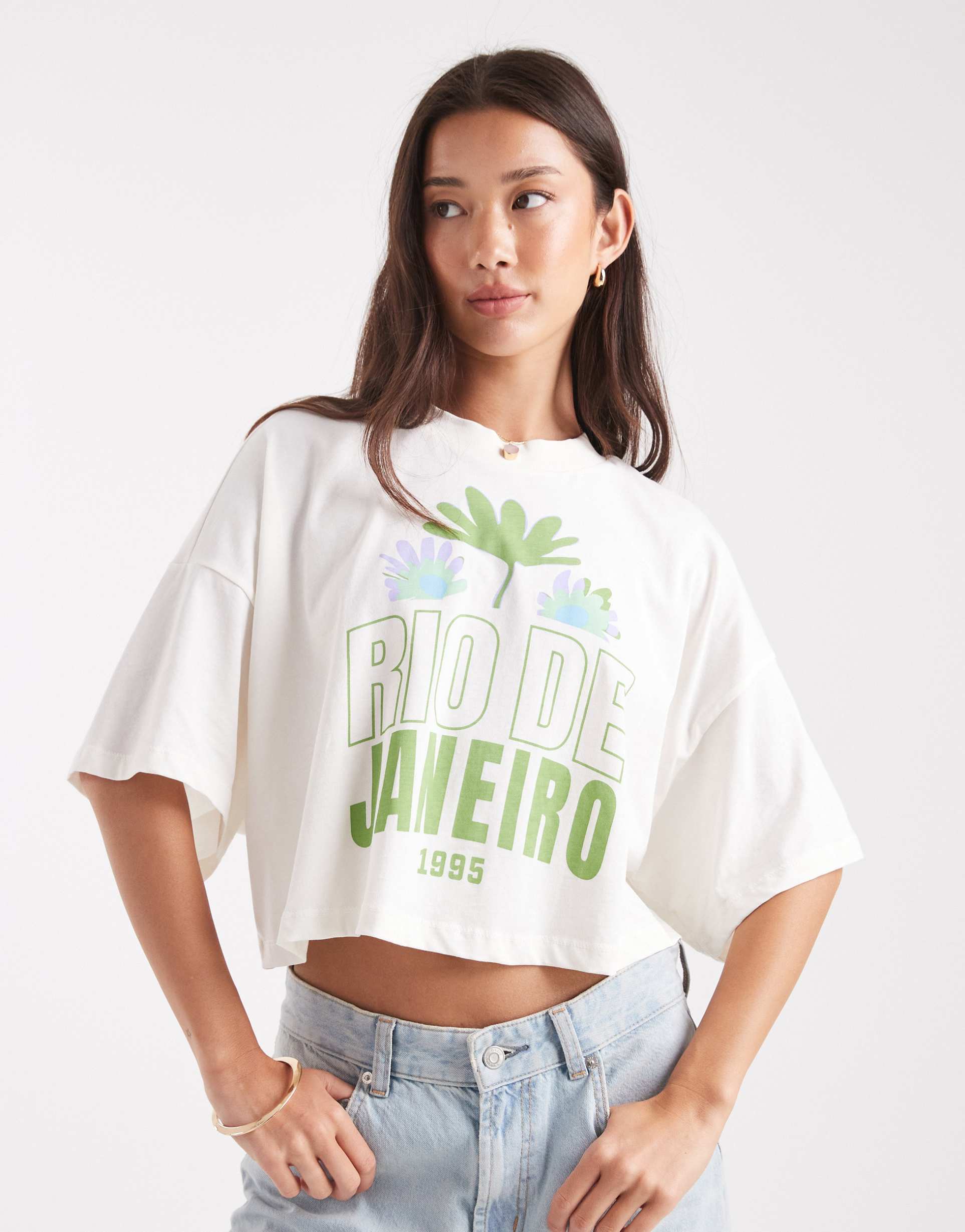 ONLY RIO GRAPHIC CROPPED T-SHIRT IN WHITE