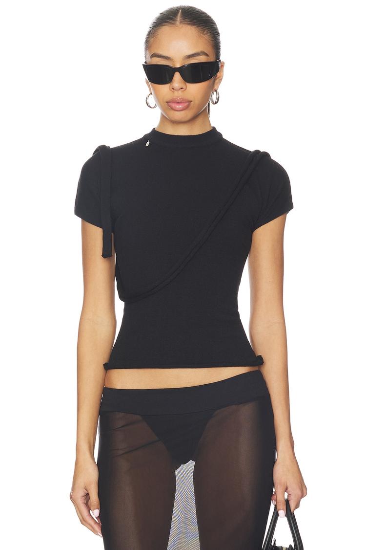 Sleek and fitted, this matte black knit shell features a sophisticated high neck and half sleeves with rolled edges at the hem and cuffs, creating a subtle deconstructed look. Crafted from a soft blend of viscose, polyester, and polyamide, it offers comfort and a modern minimalist aesthetic. The pullover style with extended trim details adds a chic touch to this waist-length top. Ideal for casual days, workwear, and business casual settings, it effortlessly blends refined style with everyday versatility.