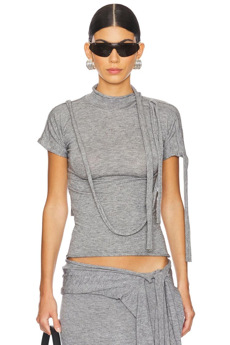 Sleek slinky jersey in a minimalist gray tone defines this slim-fit Tank top with a classic crew neck and sleeveless wide strap styling. The waist-length silhouette is enhanced with self-tie draping accents gracefully cascading from the front to the back, adding modern dimension and texture. Crafted from a comfortable blend of viscose, polyester, and polyamide, this pullover piece is perfect for casual days, streetwear looks, or relaxed brunch outings. Its clean lines and subtle detailing create a quietly sophisticated, versatile addition to your contemporary wardrobe.