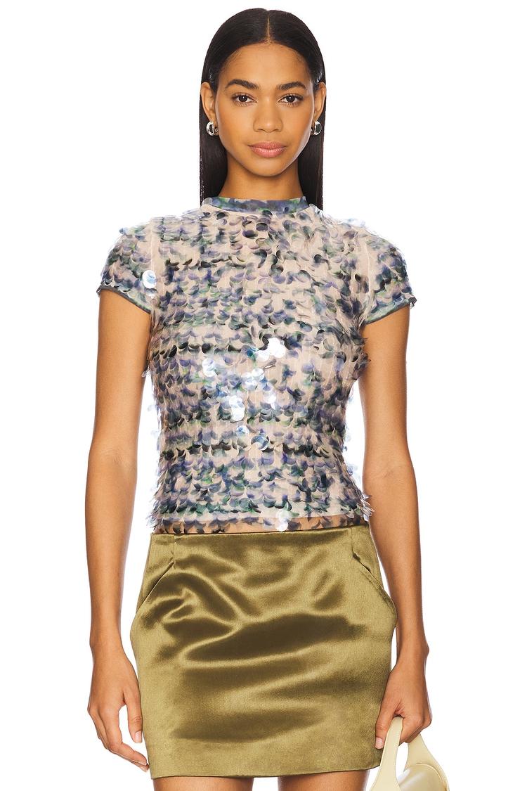 Shimmering sequins adorn this fitted shell top in a light pink hue, creating an elegant and chic look perfect for evening occasions. Featuring a classic round neck and half sleeves, this hip-length tee offers a flattering silhouette enhanced by its midweight polyester-spandex blend fabric. The loop button closure at the back neckline adds a subtle functional detail. Ideal for cocktail parties, night outs, and other festive events, this piece combines trendy design with sophisticated appeal.