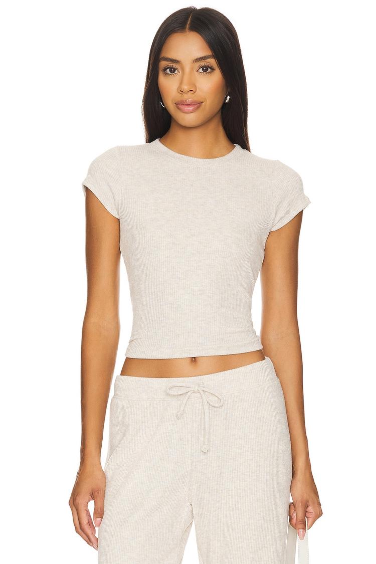 Effortless everyday chic begins with a neutral staple. This cropped Sweater Rib Baby Tee comes in a lightweight ivory-beige rib knit that feels soft and breathable. The crew neck, cap sleeves and snug, fitted silhouette give a polished, pared-down look. A cropped hem pairs perfectly with high-rise jeans, shorts, or a comfy lounge set. Made in the USA from a blend of 62% polyester, 33% viscose, and 5% spandex, it offers gentle stretch for all-day comfort. Versatile and easy to layer, it transitions from casual days at home to low-key weekend outings with just the right touch of understated elegance.