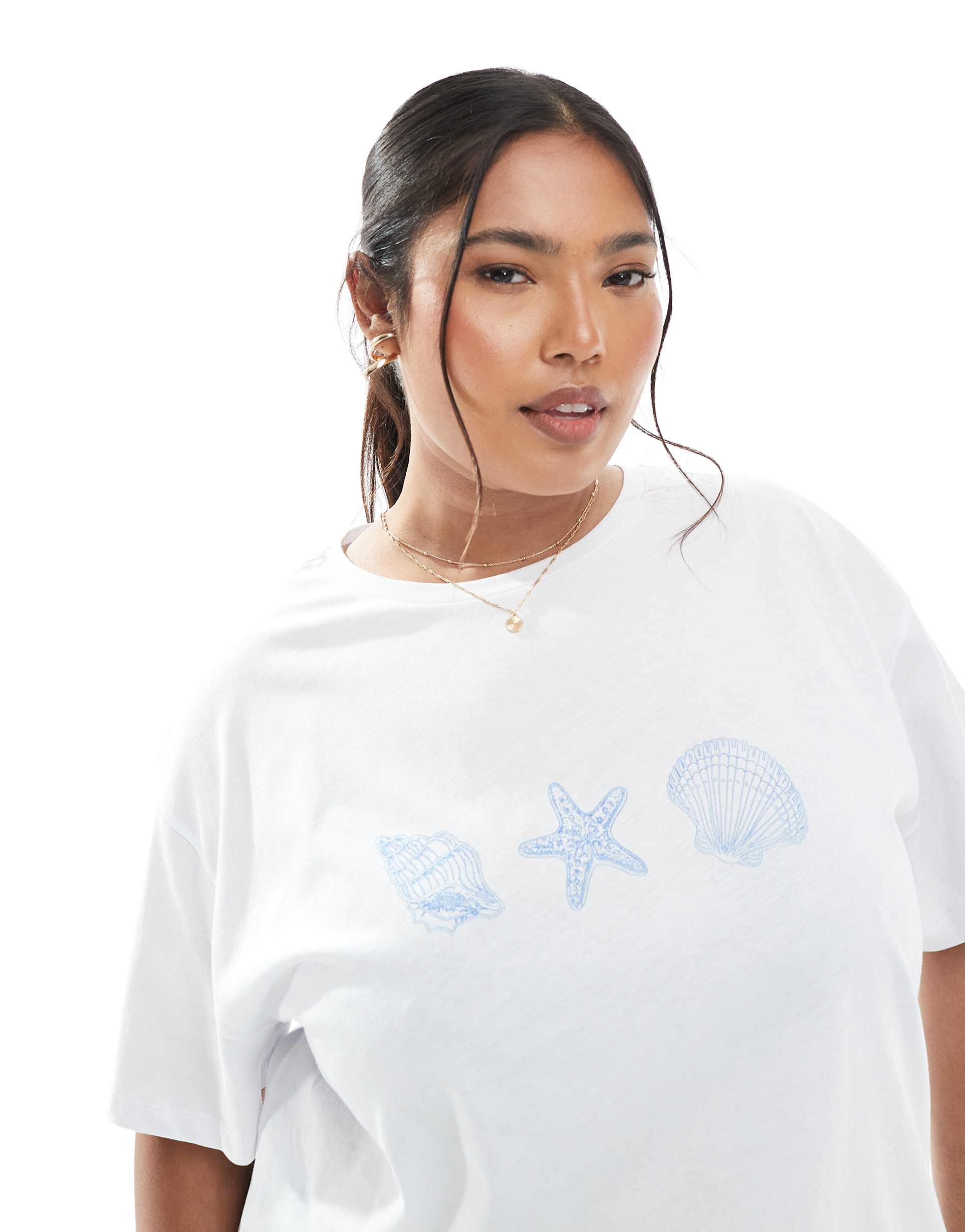 PIECES CURVE OVERSIZED T-SHIRT WITH 3 SEASHELL GRAPHIC IN WHITE