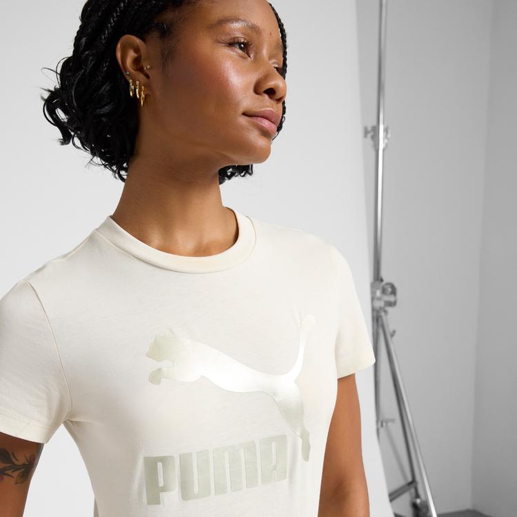 PUMA CLASSICS SHINY LOGO WOMEN'S T-SHIRT IN WHITE, SIZE M