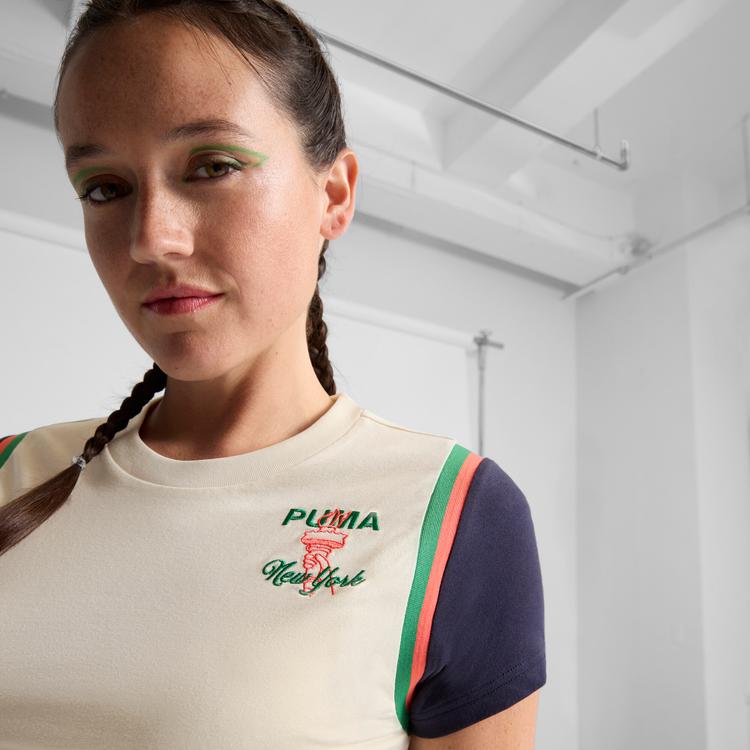 PUMA WARDROBE ESSENTIALS BRIGHT LIGHTS NYC FLAGSHIP WOMEN'S BABY T-SHIRT IN WHITE, SIZE L