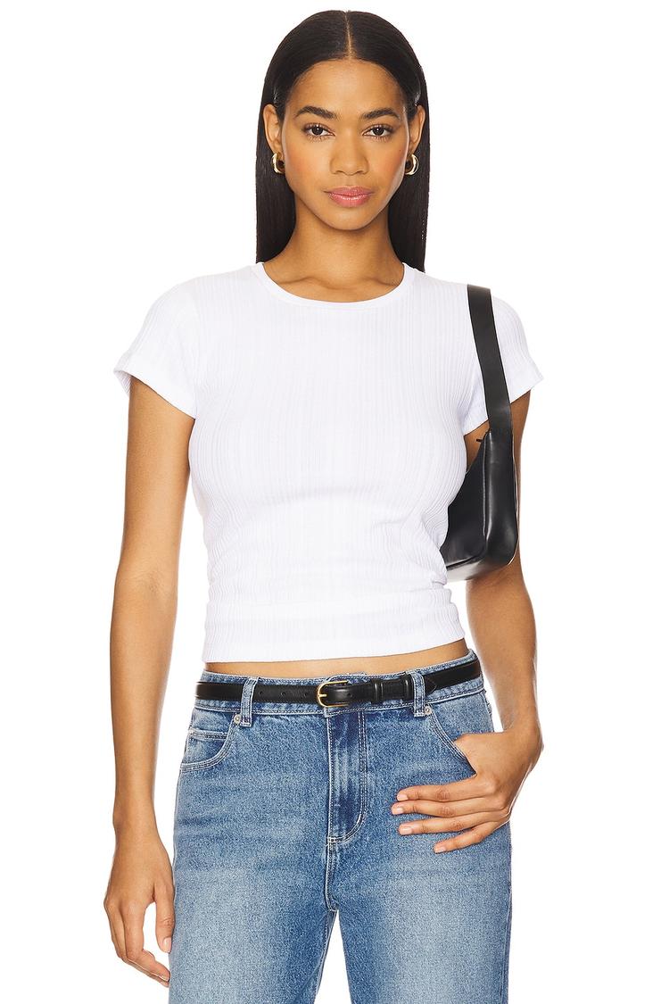 Ribbed jersey fabric and a fitted silhouette define this 60s-inspired slim tee in crisp white cotton with a touch of elastane for stretch. Featuring a classic crew neck and half sleeves, this waist-length top offers a clean, minimalist look ideal for casual everyday wear, brunch, or travel. The simple pullover design and covered back make it easy to style with jeans or skirts for a chic yet effortless vibe across spring, summer, and autumn seasons.