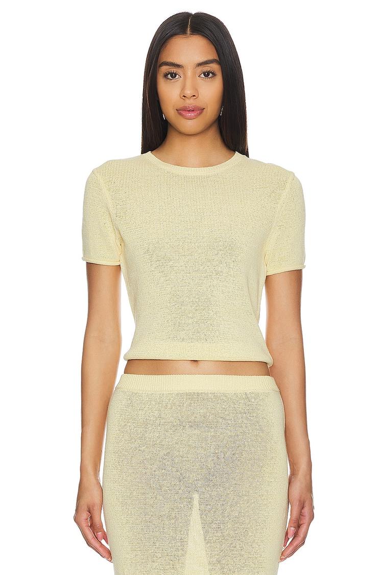 Softly knitted from a linen, cotton, and nylon blend, this fitted cropped baby tee offers a minimalist aesthetic with its light yellow hue and classic crew neck. Featuring half sleeves and a covered back, the semi-sheer fabric adds a delicate, airy texture perfect for spring and summer days. Its cropped length and regular sleeve styling make it an ideal choice for casual outings, brunch dates, or everyday wear, blending comfort with subtle sophistication.