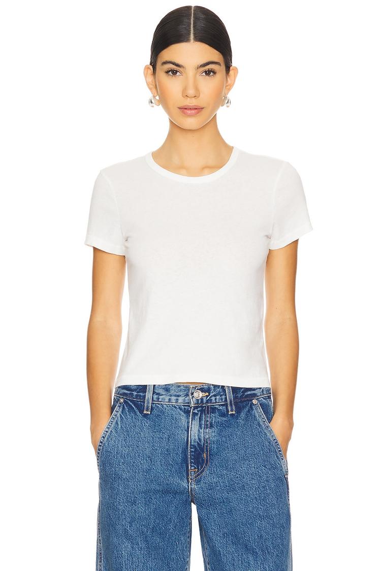 Crisp white cotton jersey fabric and a fitted silhouette define this Cropped baby tee featuring a classic crew neck and half sleeves. Its pullover style and cropped length make it an ideal versatile piece for casual everyday wear, brunch outings, or travel. The minimalist design delivers a clean, fresh aesthetic that pairs effortlessly with denim or layering pieces for a chic, relaxed look.