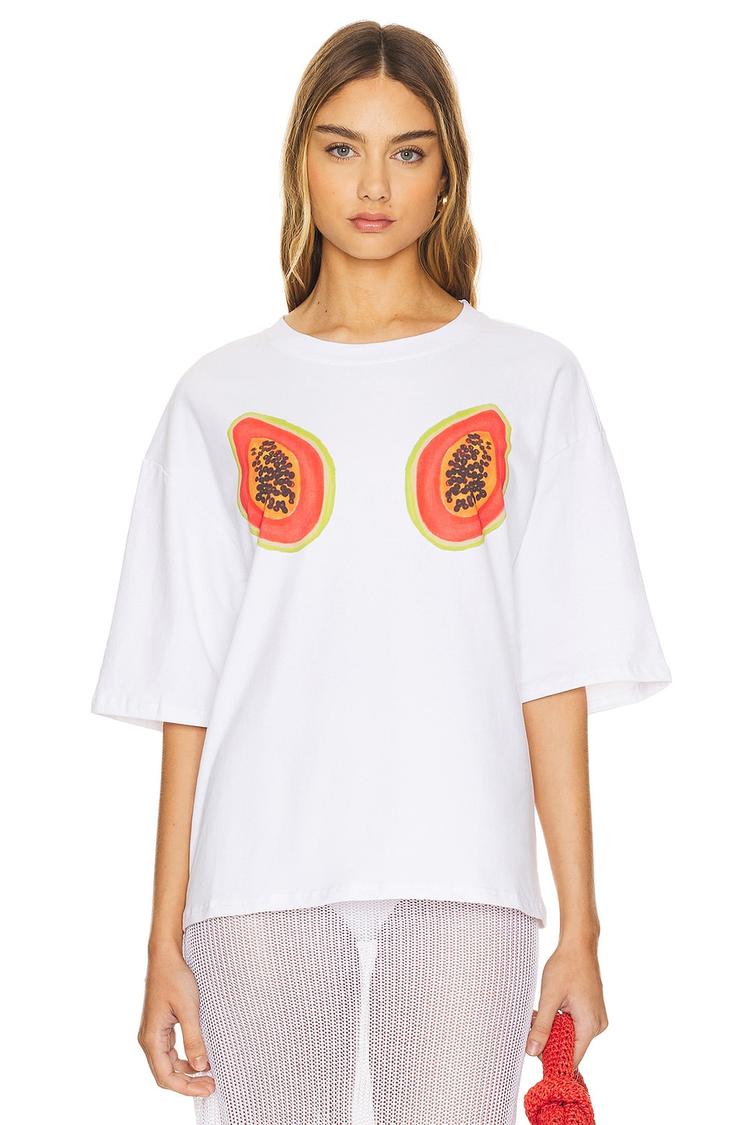 Loose-fitting boxy t-shirt crafted from a comfortable cotton-spandex jersey blend features a classic crew neck and half sleeves. The hip-length silhouette offers easy pullover styling perfect for casual days, travel, or everyday streetwear. Bold front graphic details in vibrant orange and peach hues add a playful, artistic touch to the crisp white base, creating a standout piece with a relaxed, casual chic vibe.