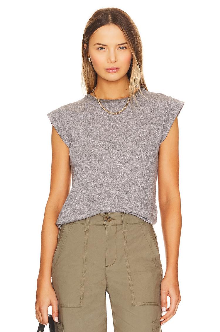 Soft, lightweight jersey fabric combined with a minimalist silhouette defines this Peak Shoulder Tee. Featuring a regular fit and classic crew neck, the cap sleeves add a subtle edge while keeping the sleeveless style comfortable and versatile. Its waist length hem pairs effortlessly with casual bottoms, making it ideal for everyday wear, travel, or relaxed weekend outings. Crafted from a breathable cotton-polyester-rayon blend, this gray matte top offers a timeless casual chic look that works seamlessly across spring, summer, and autumn seasons.