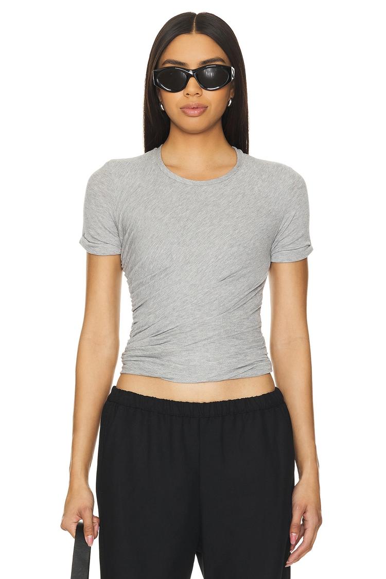 Softly ruched detailing enhances this fitted shell tee in a versatile gray hue. Crafted from a comfortable modal-spandex blend, it features a classic crew neck and half sleeves for everyday ease. Its waist-length silhouette and pullover styling make it a perfect casual chic essential, ideal for travel, loungewear, or relaxed everyday looks. The subtle texture and tailored fit offer a minimalist vibe that pairs effortlessly with a variety of bottoms, making it a reliable choice for casual, weekend, or work-from-home occasions.