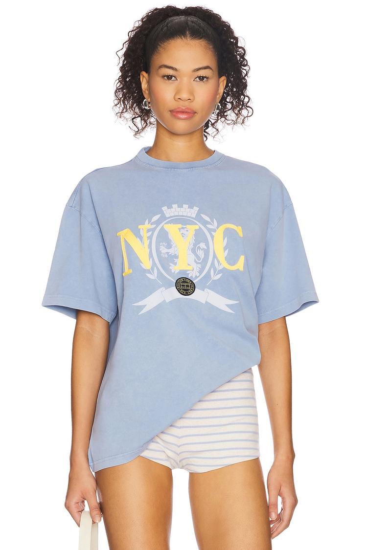 Soft, midweight cotton jersey and a relaxed fit combine to create this classic varsity tee with a crew neck and half sleeves. Featuring a hip-length hem and a front graphic with embroidered lettering, this versatile shirt is ideal for casual outings, everyday wear, and brunch dates. The muted light blue base color is complemented by yellow and white embroidered details, adding a timeless sporty vibe to your wardrobe.
