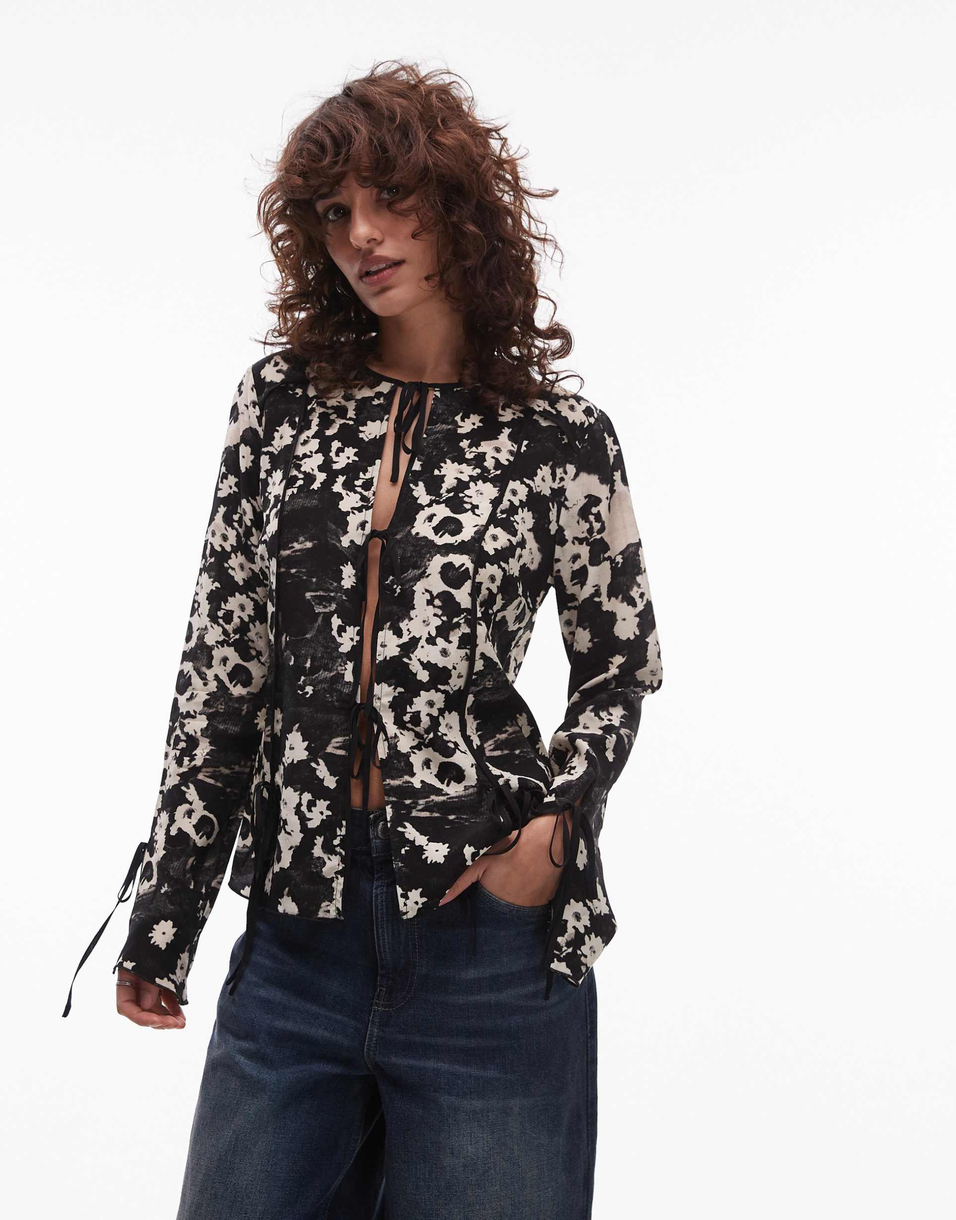 TOPSHOP BINDING BED JACKET IN BLURRED BLACK AND WHITE FLORAL
