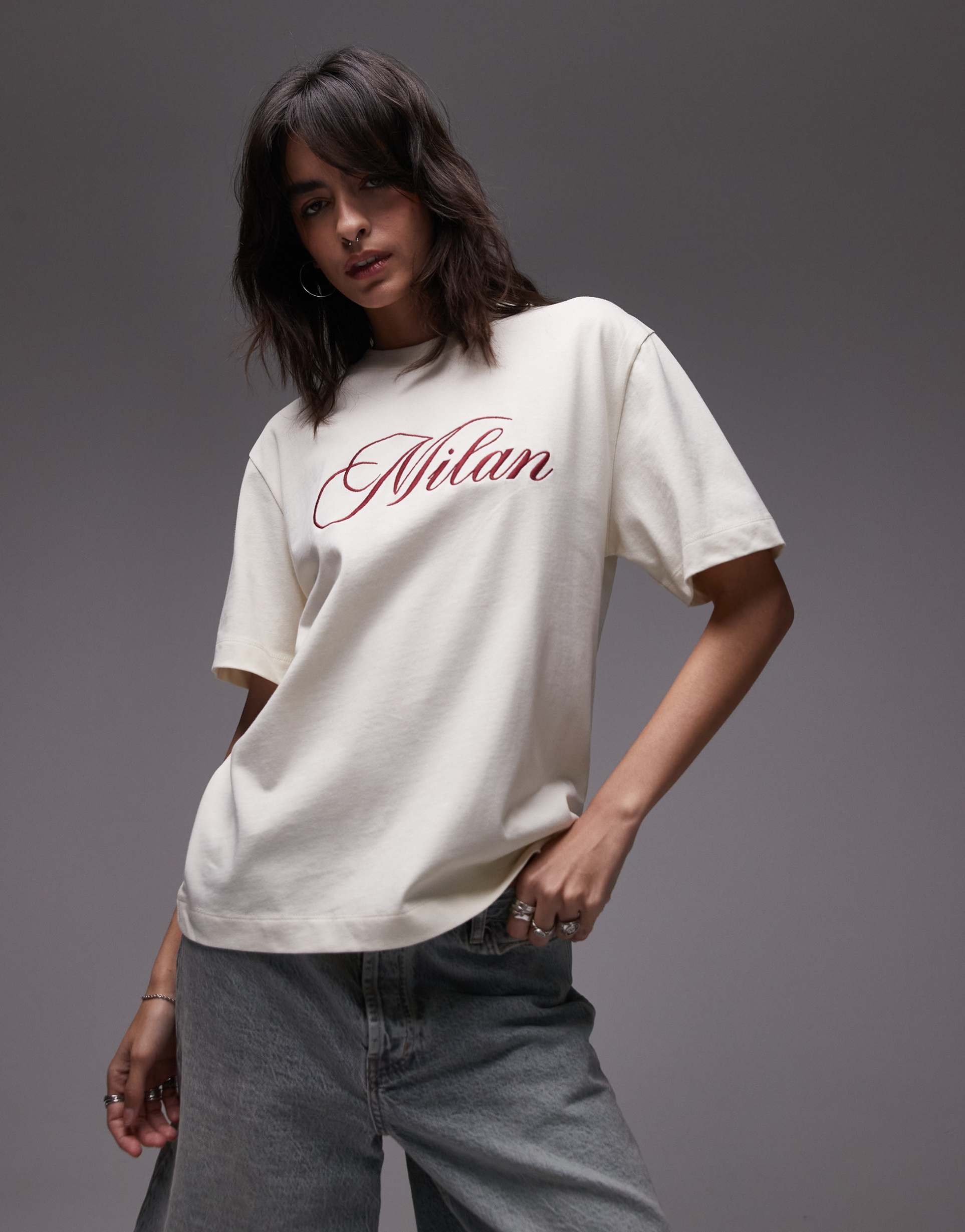 Soft, breathable cotton in a matte off-white shade forms this regular fit shell with a classic crew neck and comfortable half sleeves. The hip-length hem and relaxed silhouette make it ideal for casual outings, everyday wear, or street style looks. The standout feature is the burgundy embroidered "Milan" script across the front, lending a minimalist yet chic aesthetic. Crafted from premium jersey fabric, this pullover tee combines comfort and style effortlessly for versatile seasonal wear from spring through autumn.