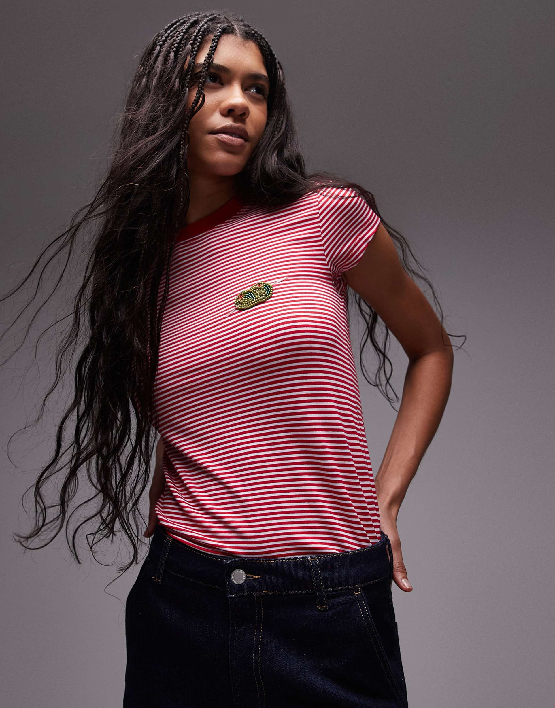 TOPSHOP EVERYDAY TEE WITH OLIVE EMBROIDERY IN RED STRIPE