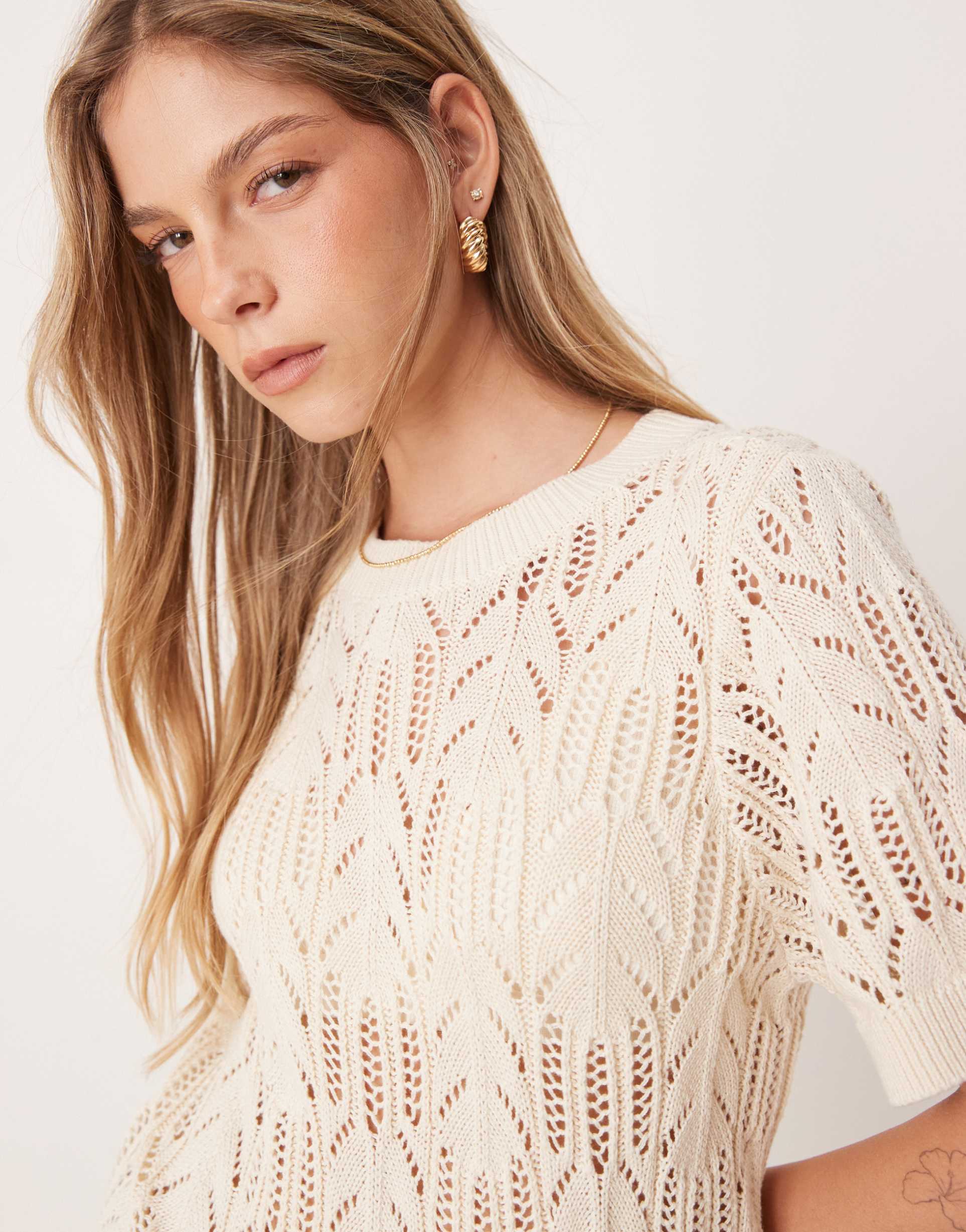VILA SHORT SLEEVE OPEN KNITTED T-SHIRT IN BIRCH CREAM