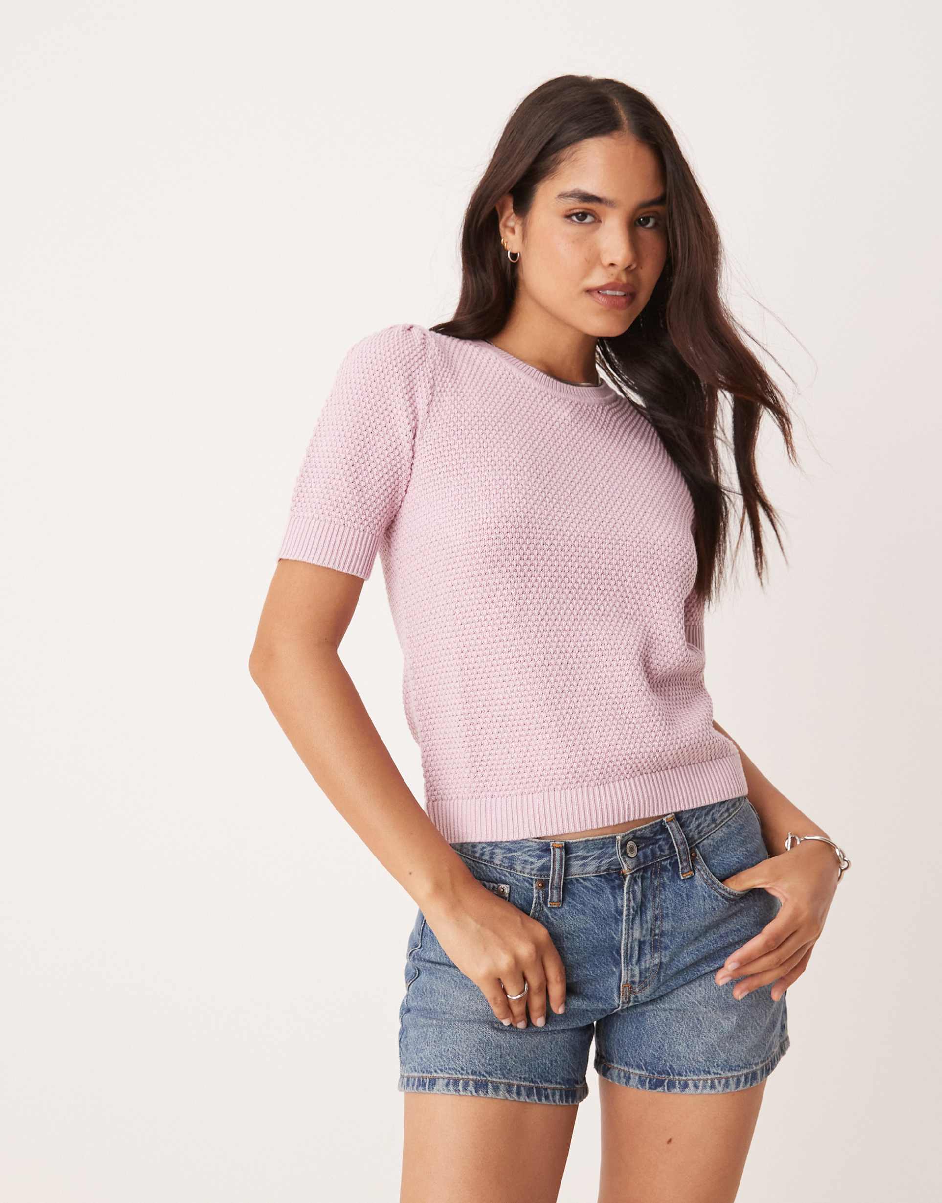 VILA SHORT SLEEVE TEXTURED KNITTED T-SHIRT IN ORCHID PINK