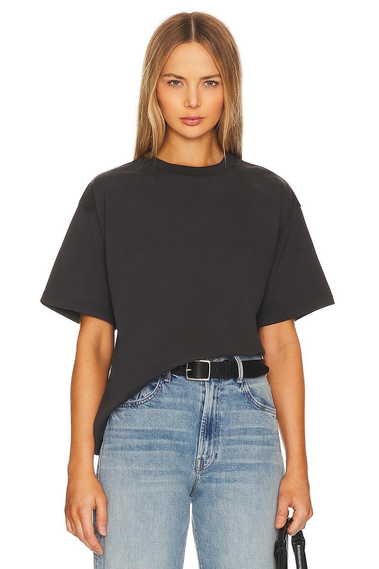 With a relaxed, boxy fit and dropped shoulders, this matte black tee crafted from midweight cotton jersey offers both comfort and understated style. The classic rib knit crew neck and half sleeves enhance its minimalist appeal, while the straight hem adds a clean finish. Ideal for casual outings, everyday wear, or streetwear looks, this versatile hip-length tee combines simplicity with effortless cool for all-season wear.