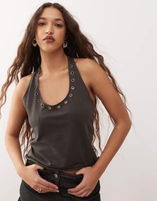 WEEKDAY HALTER NECK TOP WITH GROMMET DETAILS IN OFF-BLACK