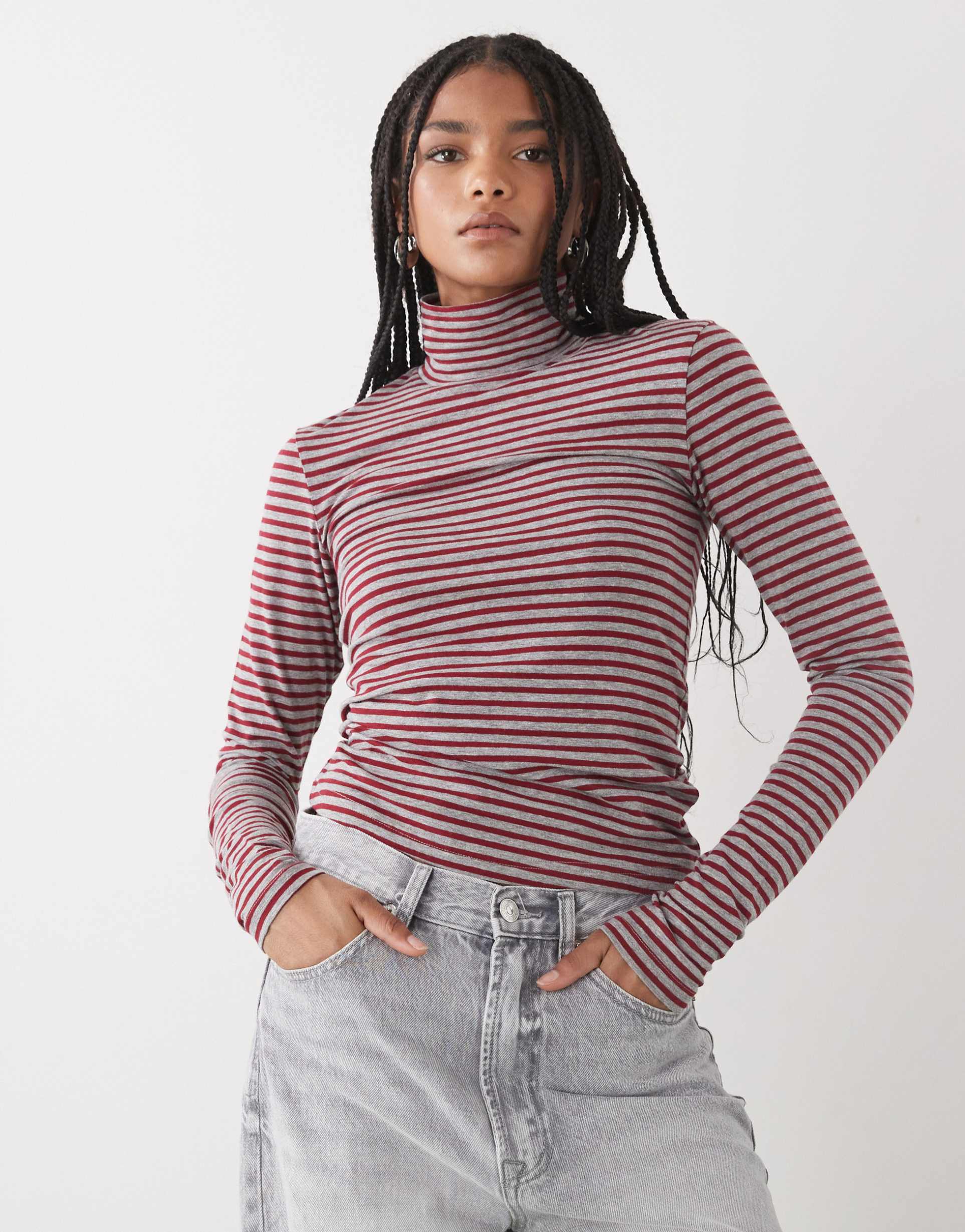 WEEKDAY SLIM FIT TURTLENECK LONG SLEEVE T-SHIRT IN RED & GRAY STRIPE