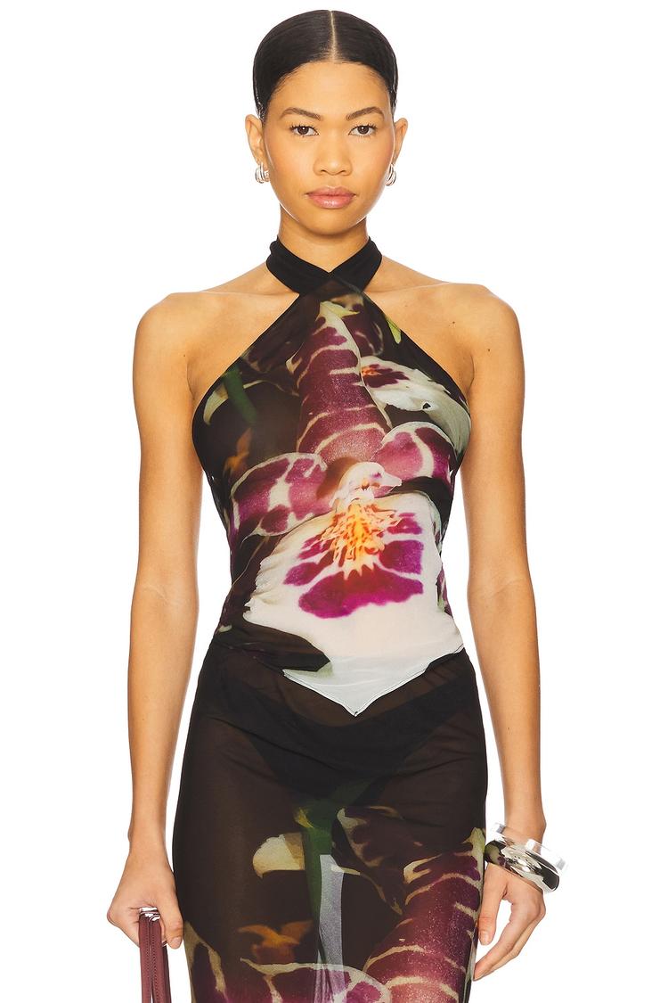 A bold halterneck camisole crafted from lightweight sheer mesh and viscose, featuring an all-over floral print in dusty rose and purple hues on a black base. The cropped length and close fit accentuate the silhouette, while the back tie closure adds a flirty, adjustable detail. Perfect for spring and summer nights, this trendy, sexy top is ideal for beach outings, girls' nights, and vacation parties, offering both allure and breathability in a modern, statement-making design.