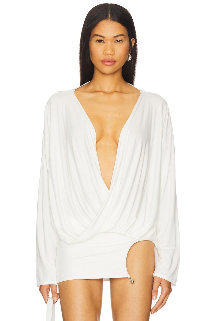 Soft jersey fabric and a draped front wrapping design create a relaxed yet sexy silhouette in this thigh-length wrap top. The plunging neckline and long sleeves balance allure with coverage, while the relaxed fit offers comfortable wear. Ideal for casual outings, night outs, or date nights, this modern and chic piece transitions seamlessly across occasions. The clean white hue enhances its versatile appeal, making it a standout layered or statement piece in any wardrobe.