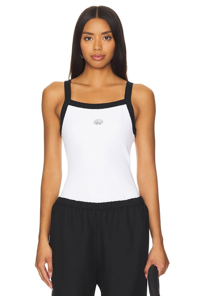 Effortless coastal chic meets everyday polish in the Amelie Top. A clean white cotton jersey tank with bold black trim along the square neckline and wide shoulder straps creates a modern, architectural silhouette. The front shell detail adds subtle texture to a sleek, pull-on style that fits close through the torso. Hip-length and versatile, it pairs effortlessly with high-waist shorts, joggers, or a light blazer for warm-weather workdays or weekend brunch. Breathable, soft-touch cotton keeps you comfortable from sun-drenched days to cool evenings, making this essential top a timeless addition to any capsule wardrobe.