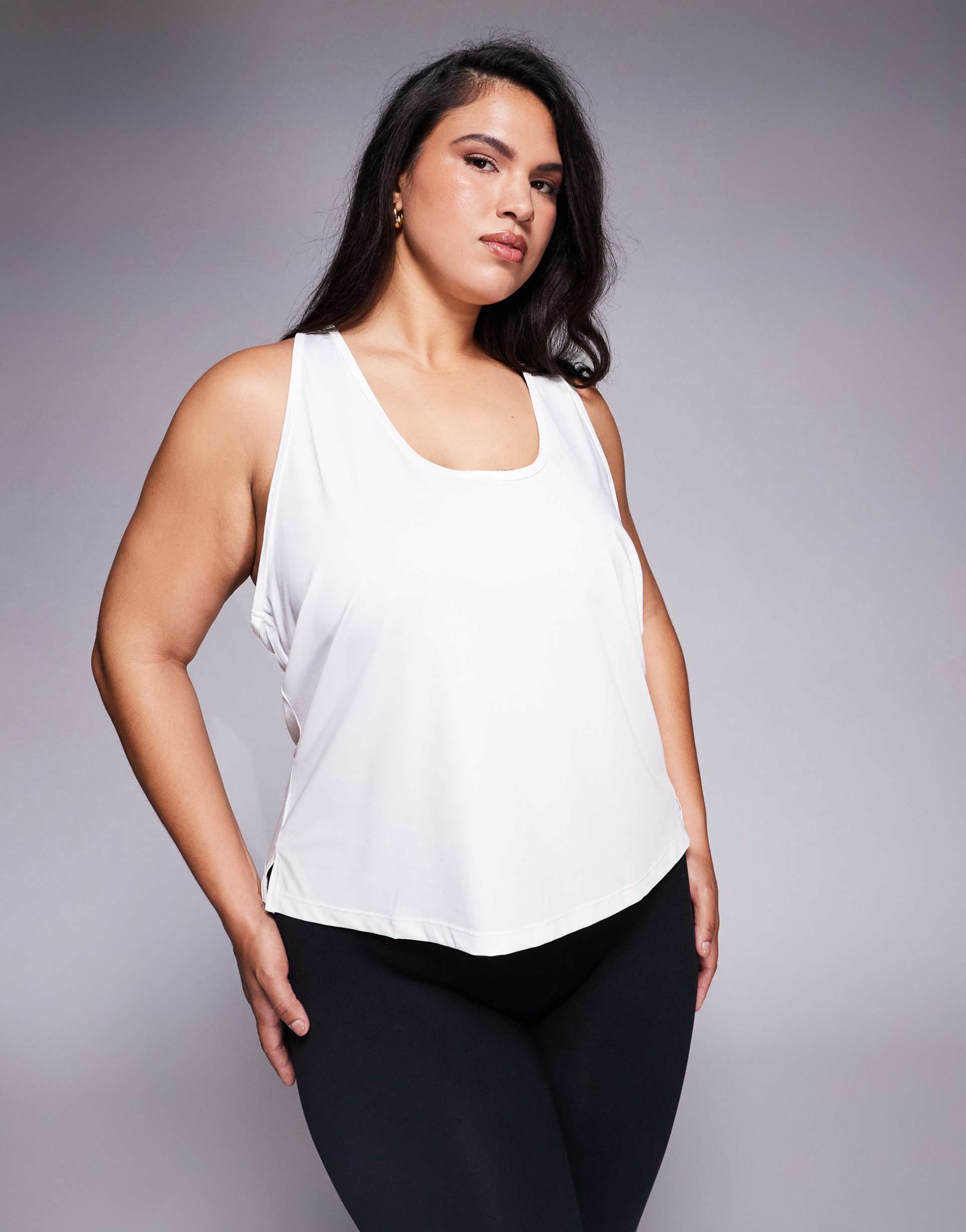Smooth, stretchy polyester with elastane delivers a relaxed fit and breathable comfort in this white tank top featuring a classic round neck and sporty racerback. The hip-length hem and sleeveless, strapless styling provide effortless movement and ventilation, making it ideal for workouts, athleisure, and casual wear. Quick-dry technology enhances performance for active days, while the slip-on closure ensures easy dressing. This versatile plus size tank combines functionality with a minimalist sporty chic look, perfect for a range of occasions from gym sessions to casual outings.