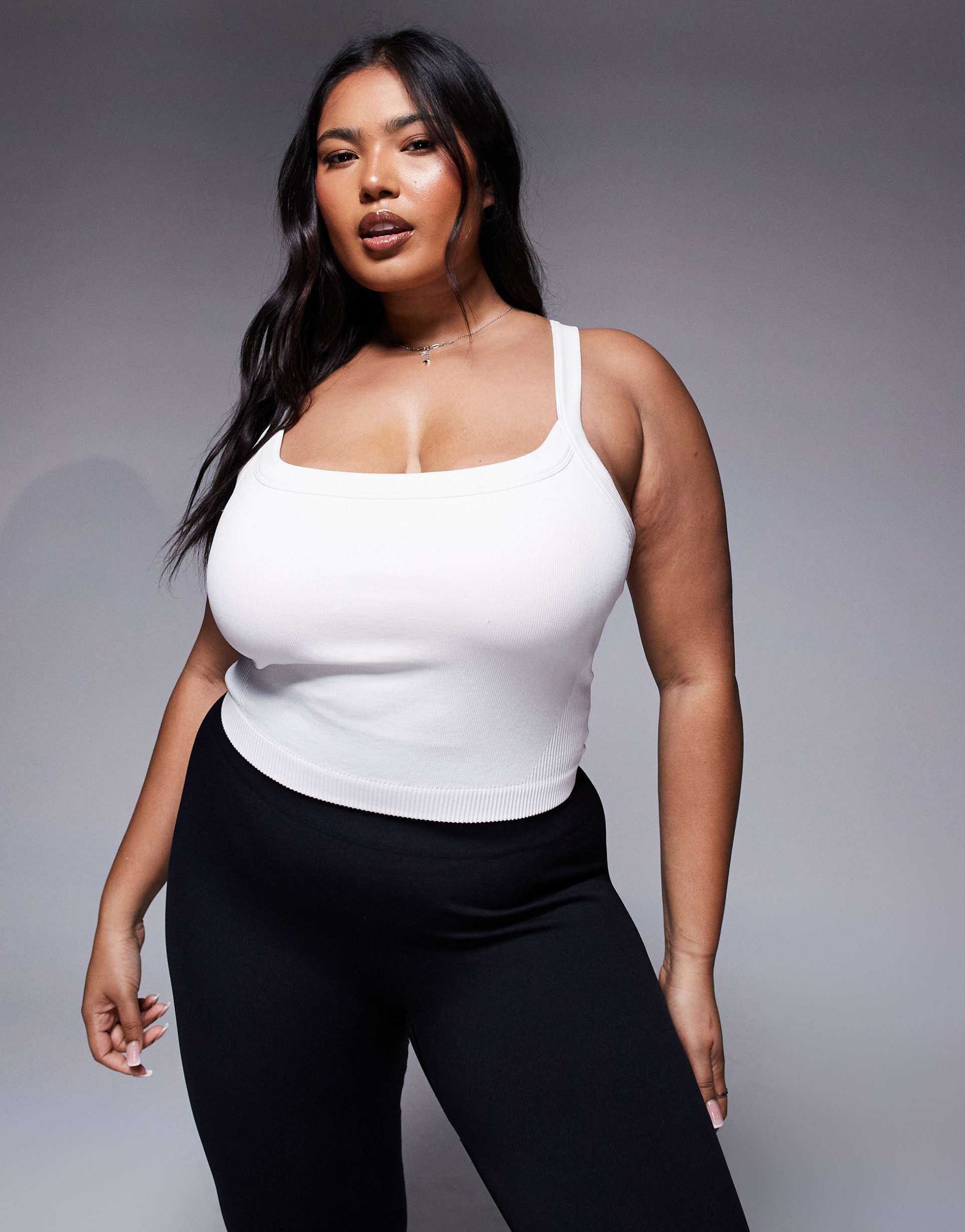 Seamless construction and a slim fit define this white tank top with a flattering scoop neck and wide straps, perfect for unrestricted movement thanks to its racerback design. Crafted from a smooth blend of polyamide and elastane, this waist-length top sculpts and supports with an inner shelf bra, making it ideal for athleisure, workouts, and casual wear. Its breathable fabric and minimalist style ensure comfort and versatility across all seasons, whether you're hitting the gym or running errands.