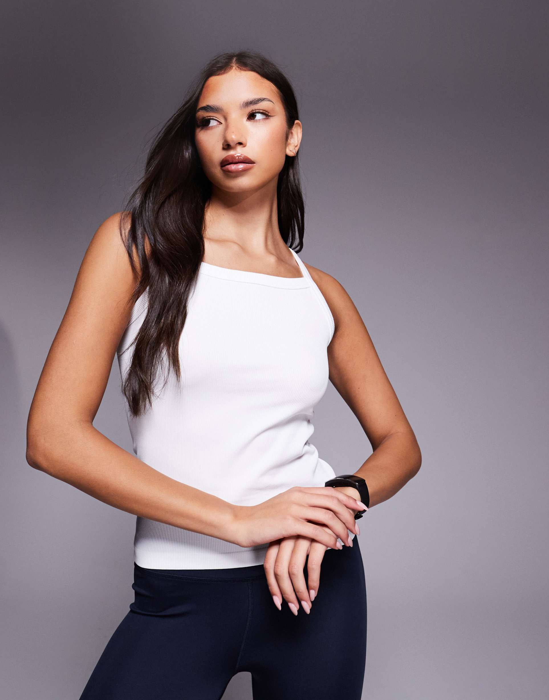Soft rib knit fabric and a slim fit combine in this high neck tank top, evoking the 90s sporty chic vibe. Featuring fixed straps and a sleek silhouette, this seamless design offers comfort and stretch with polyamide and elastane blend jersey. Its waist length and sleeveless cut make it perfect for warm weather workouts, athleisure days, or casual outings. The minimalist white color and high neckline add a subtle yet sophisticated touch to your activewear collection.