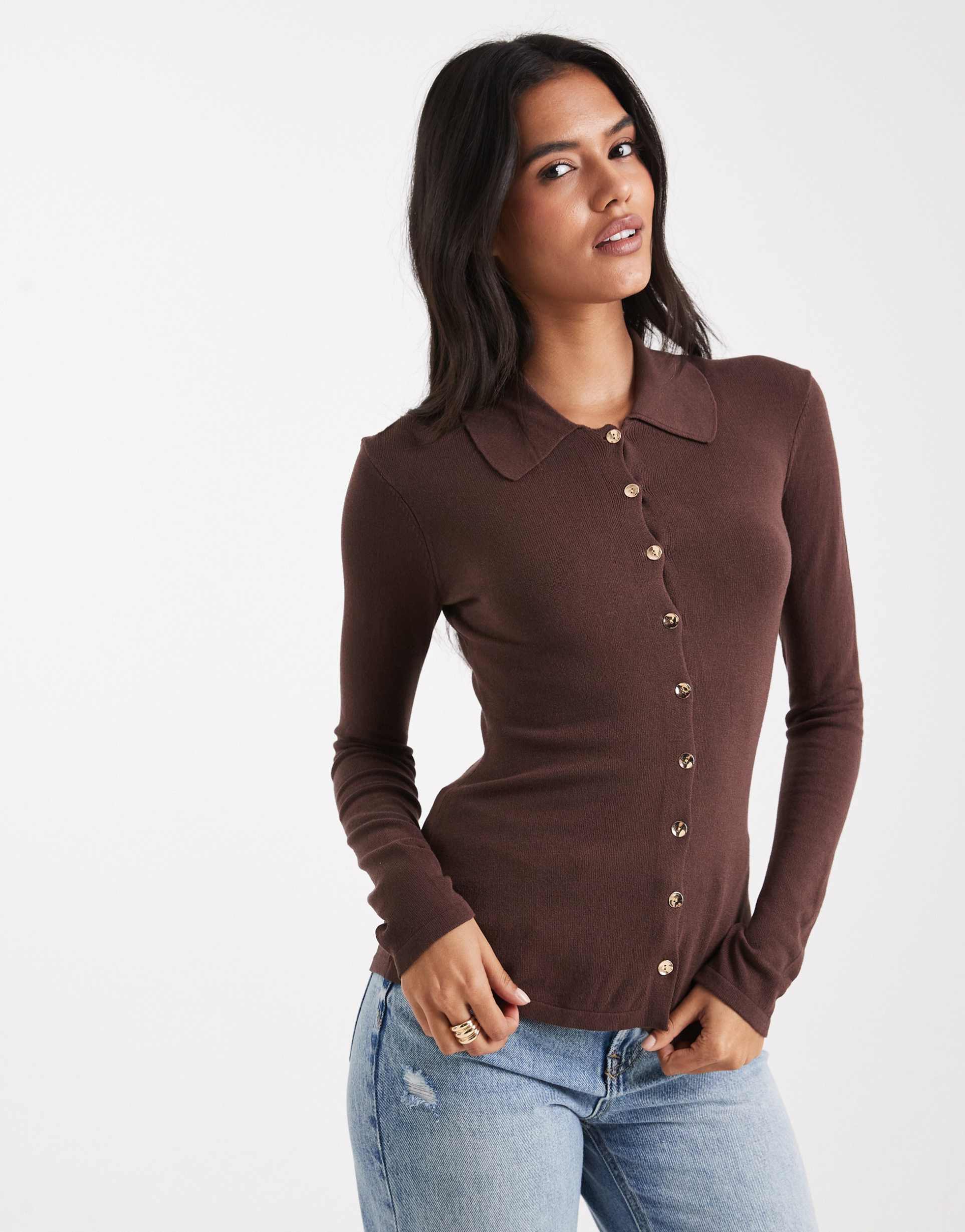 4TH & RECKLESS FITTED RIB KNIT GOLD-TONE BUTTON UP COLLARED TOP IN CHOCOLATE