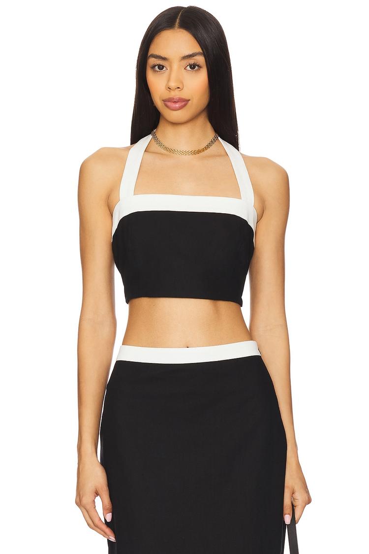 Bold monochrome styling comes alive in this cropped halter neck top crafted from midweight cotton canvas. The fitted silhouette and sleeveless design showcase a chic minimalist vibe, while the contrasting white band along the neckline and hem adds a crisp, modern edge. A hidden side zipper closure ensures a sleek finish. Perfectly suited for warm weather, this versatile piece transitions effortlessly from casual brunches and laid-back date nights to lively evenings out, embodying a confident, contemporary aesthetic.