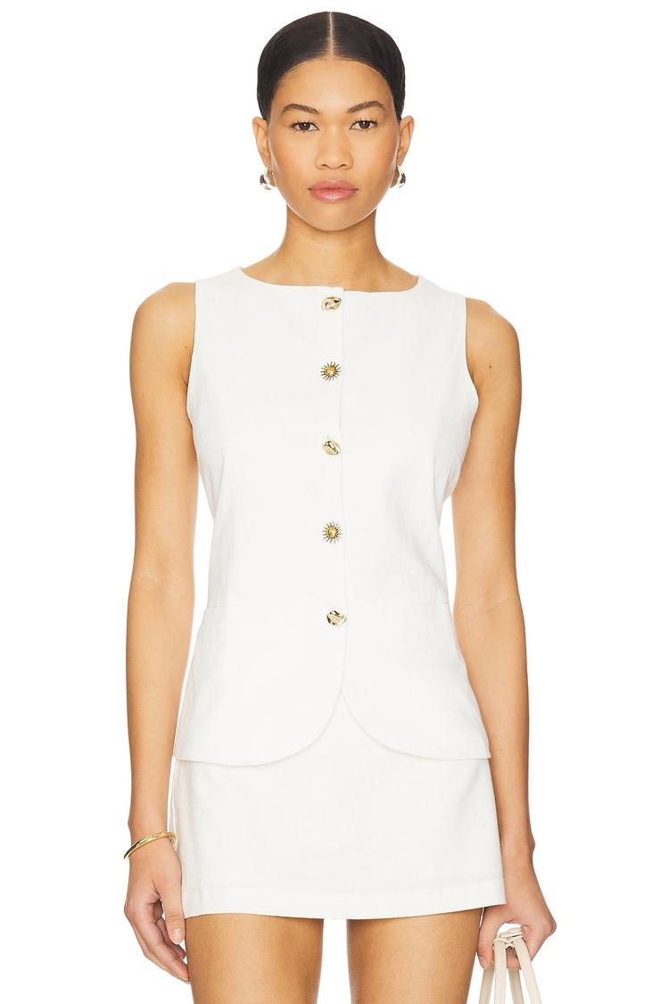 Effortless elegance meets minimalist design in this fitted shell top crafted from a breathable blend of linen, cotton, polyester, and elastane. Featuring a classic round neckline and sleeveless cut, it is perfectly tailored to hip length with front gold-tone button closure adding a touch of sophistication. The subtle faux welt pockets enhance the streamlined silhouette, making it an ideal choice for casual outings, workwear, or business casual settings during warmer seasons.