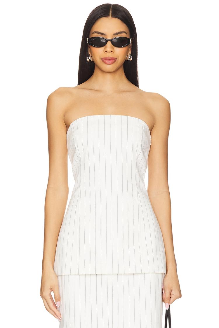 Clean lines and a classic pinstripe pattern define this bandeau top crafted from midweight cotton denim. The fitted silhouette and hip-length cut create a flattering shape, while the concealed side zipper ensures a sleek finish. Perfect for warmer seasons, its minimalist design with a strapless neckline and sleeveless styling makes it versatile for casual outings, brunch dates, or streetwear looks. The subtle gray stripes on a crisp white base add a modern edge to your wardrobe essentials.