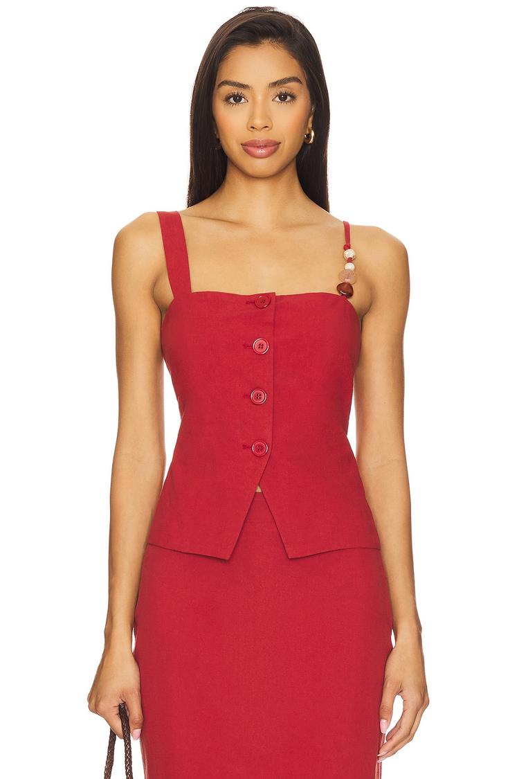 With its structured corset silhouette and fitted waist length design, this matte red Irisa Top blends classic elegance with modern chic. Crafted from lightweight cotton with polyester and elastane lining, it offers comfort and shape retention. The square neckline and sleeveless wide straps are accented by delicate beaded details on the shoulders, adding a subtle touch of sophistication. Featuring a front button closure, this top is ideal for casual outings, brunch dates, and stylish date nights during spring and summer seasons.