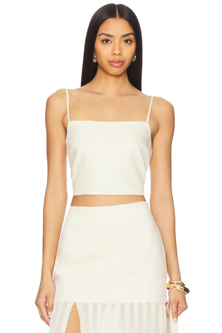 Clean lines and a sleek silhouette define this Lucian Cropped top in a crisp off-white hue. Crafted from a midweight poplin blend of viscose, cotton, polyester, and elastane, it offers a slim fit with a square neckline and delicate spaghetti straps for a minimalist, casual chic look. The pull-on style and covered back ensure easy wear. Ideal for spring and summer, this versatile cropped top pairs effortlessly with high-waisted skirts or pants for brunch, casual outings, vacations, or date nights.