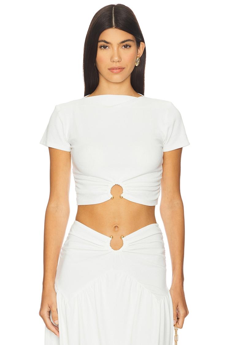 Ruched jersey fabric and a gold-tone U-ring accent create a striking detail on this cropped top. Featuring a slim fit with half sleeves and a classic round neck, this white pullover piece offers a trendy yet modern vibe perfect for spring and summer days. The covered back and cropped length balance style with comfort, making it ideal for casual outings, brunch dates, or night outs. Crafted from a soft viscose-polyamide blend, it ensures breathable wearability while adding a chic touch to your wardrobe.
