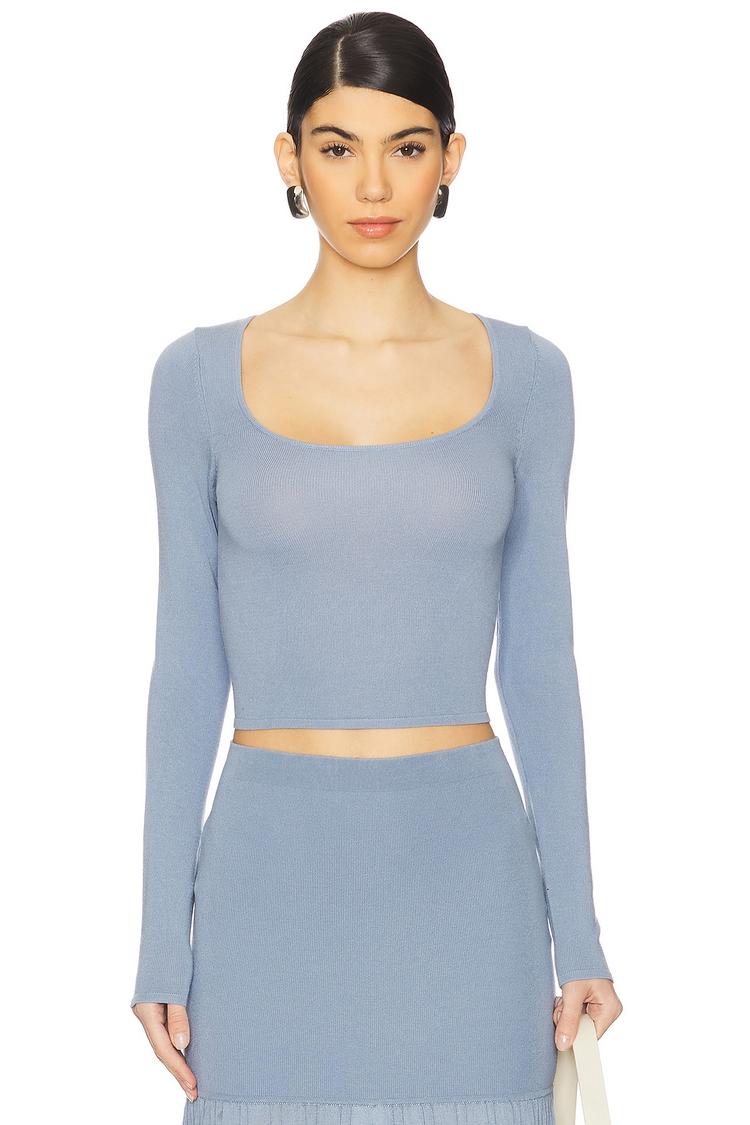 Softly sculpted in a lightweight viscose-polyamide blend, this cropped knit top features a flattering scoop neckline and long sleeves for versatile layering. Its fitted silhouette and matte light blue hue make it a minimalist essential, perfect for casual outings, brunch dates, or everyday wear. The midweight jersey fabric ensures comfort and breathability across spring and autumn seasons, while the pullover style keeps it effortlessly chic and easy to wear.